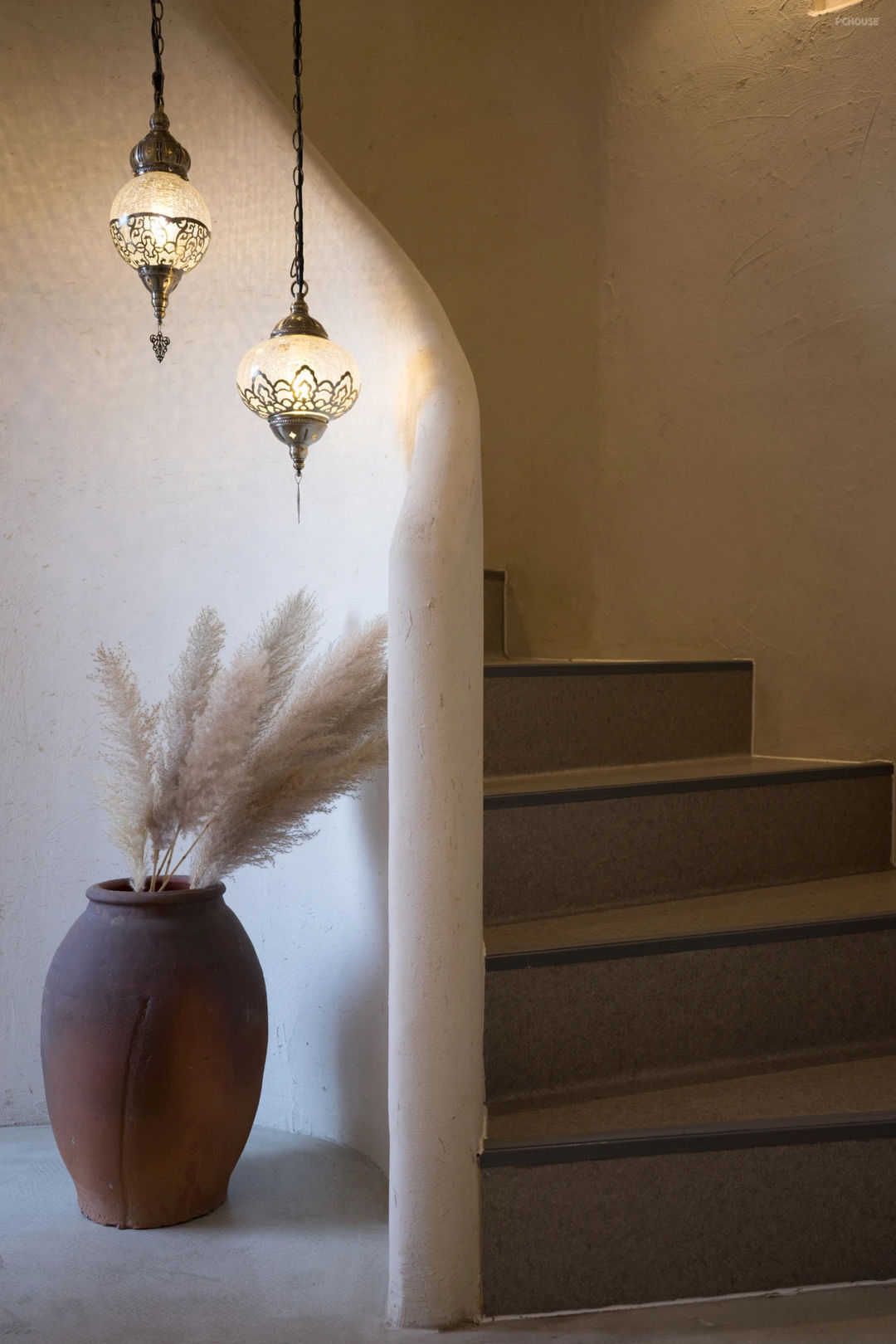 楼梯细节。极简风格的芦苇杆和吊灯竟然十分搭调。