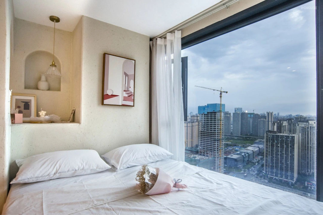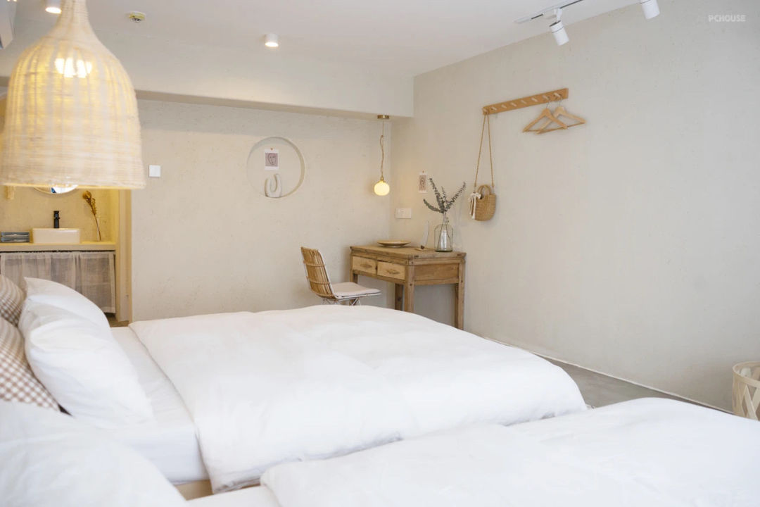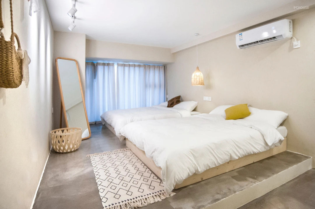 这套房子是端头户型的loft公寓,层高4.6米。考虑到民宿定位,我原本是计划将这个房子楼上楼下做成2个房,都分别带卫生间。一个宽阔并带有卖点的公共区域。后来业主考虑到经营管理就直接整合成一套房子卖,所以这个房子实际可以入驻6个人。