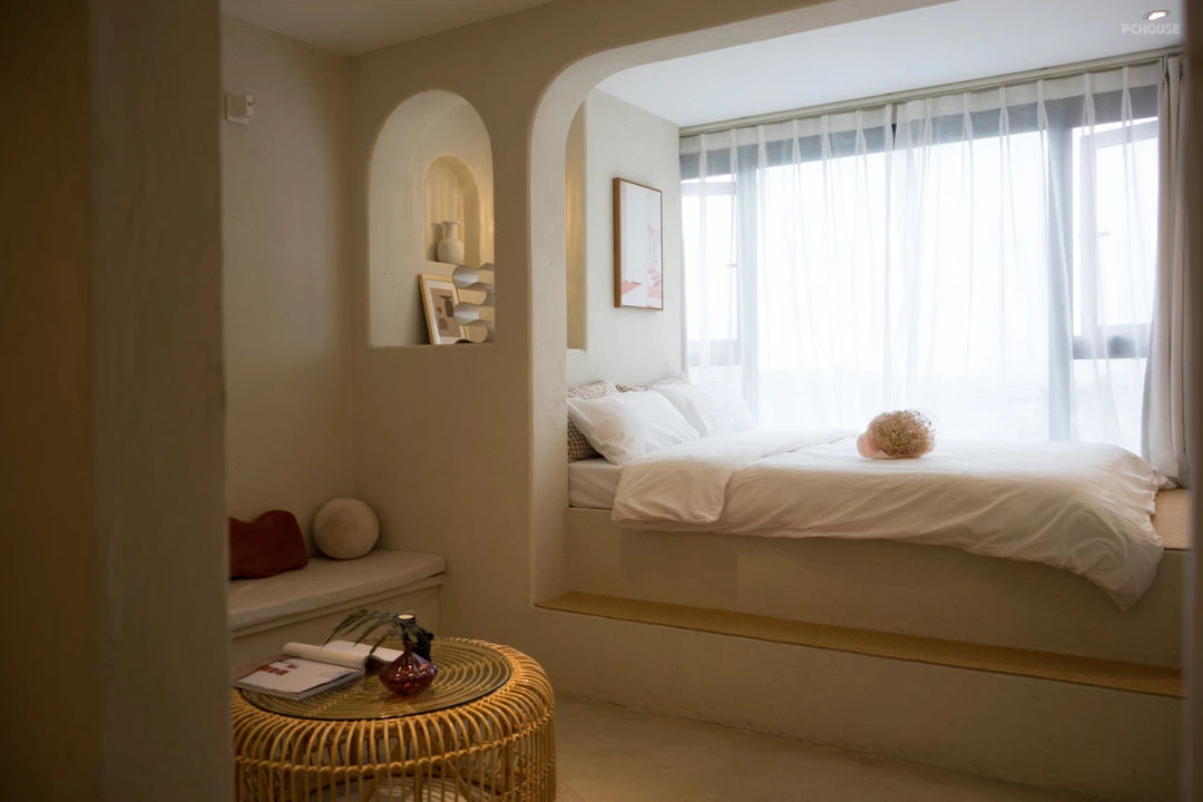 床的位置做了一个整体的抬高,在床头的位置用做了一个床头柜并且使他有一个隔断的作用,区域也因此划分的更明确。