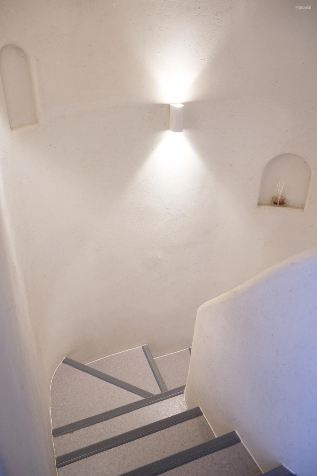 进门后的第一视角,大面积白色扑面而来,旋转楼梯尽收眼底。