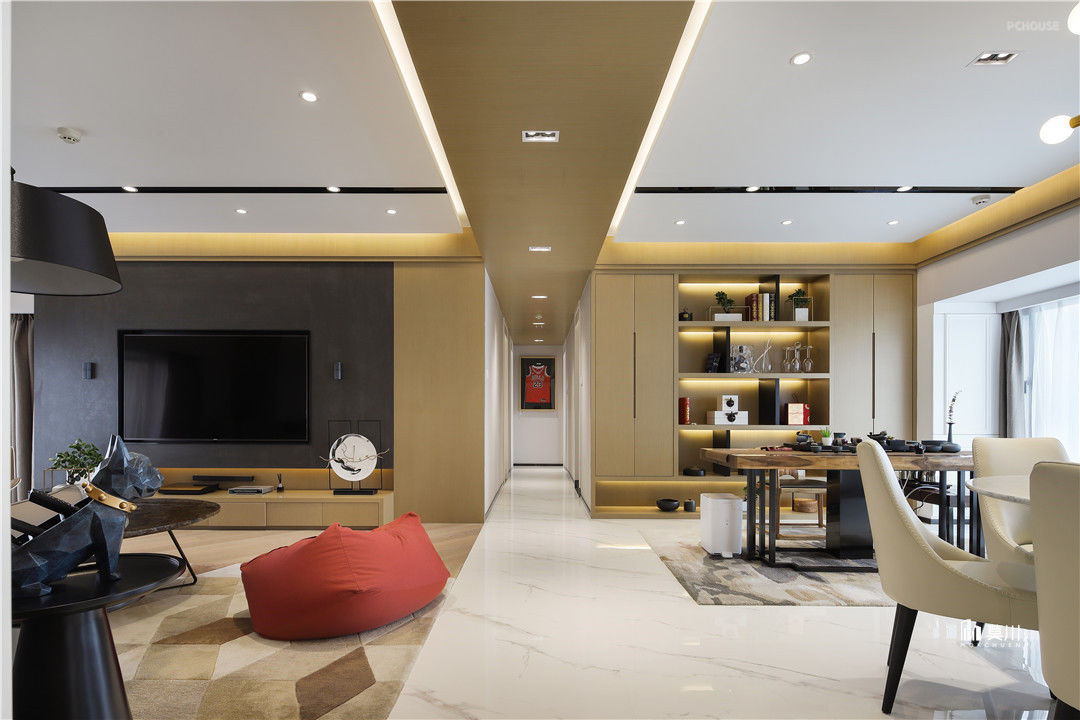 客餐厅通过木饰面天花来划分,分而不隔,通透,大气。#天花木饰面 #客厅 #置物架 #电视背景墙 #沙发