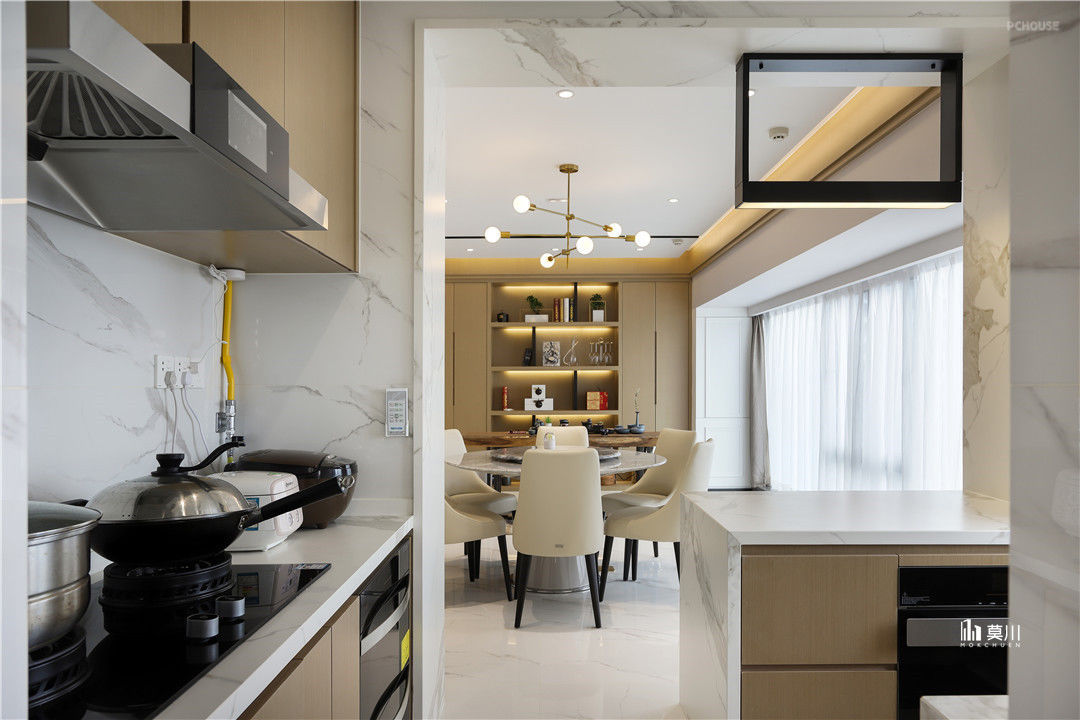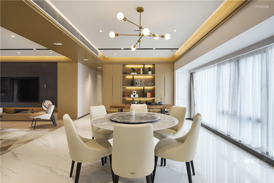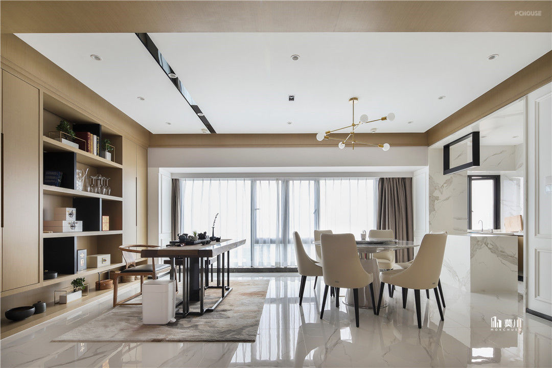餐厅与厨房的开放式布局使得活动空间宽敞,增加了家人的互动性,开敞的落地窗满足通风与采光的需求,孩子可以在阳光与微风中嬉戏。#餐厅 #餐桌 #餐椅 #餐边柜