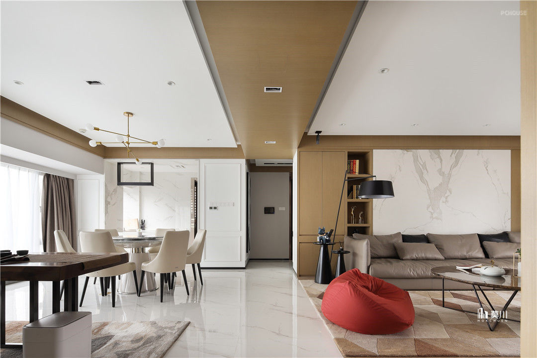 客餐厅运用木饰面与白色大理石相结合的设计手法营造出一个居家温馨的空间,木饰面上天花的设计别具一格。#客厅 #装饰画 #电视背景墙