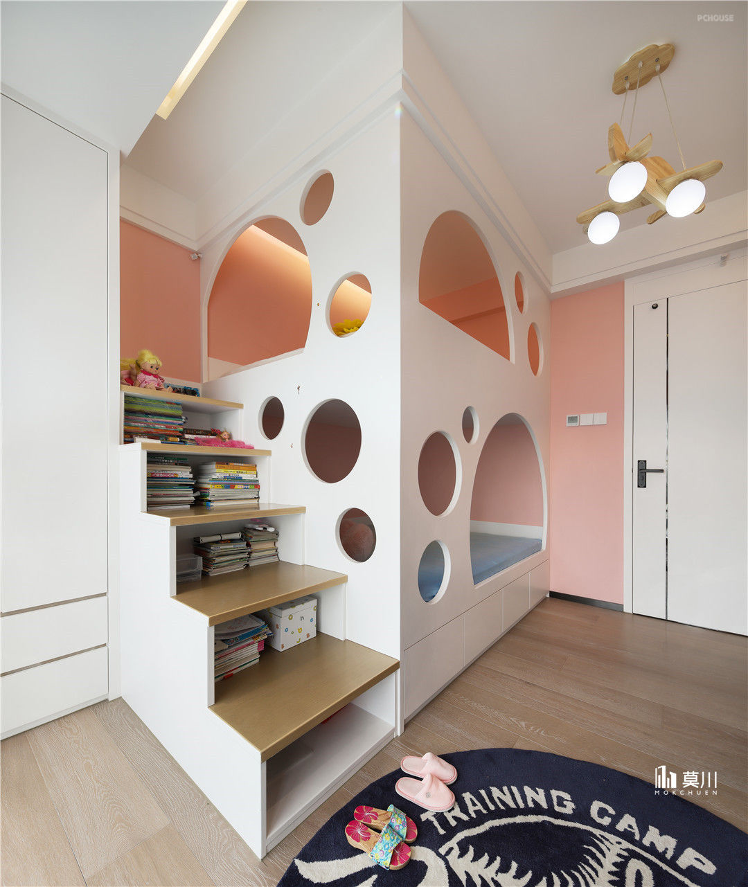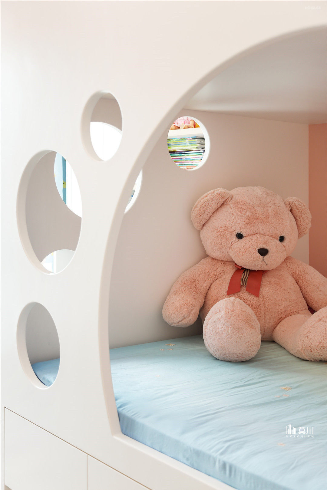 儿童房采用较为鲜艳的色彩,能帮助小孩更好的认知色彩时间。当然惊喜选择的色彩搭配也能营造出一个轻松愉悦的氛围,更利于小孩成长。#儿童房 #床 #床头柜