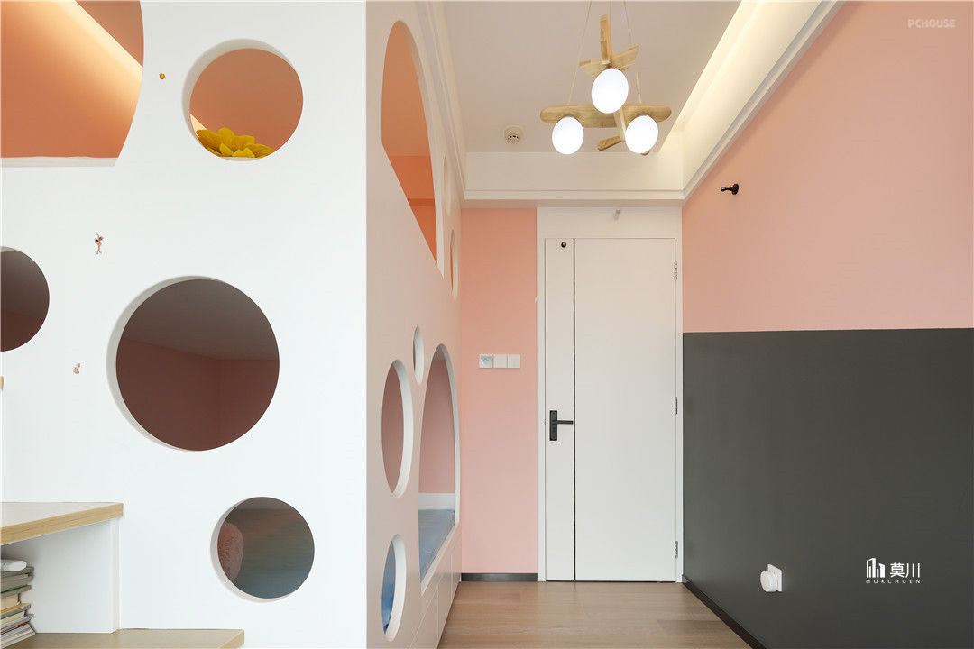 原户型厨房面积不是很大,所以设计时做开放式,分享型的设计,让空间与空间连贯相通,开放式的布局让孩子的活动空间更为宽敞,增加互动性。