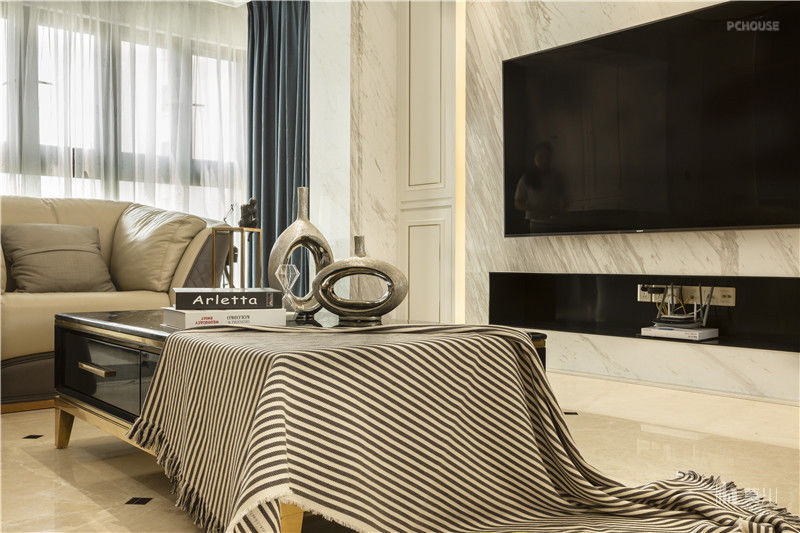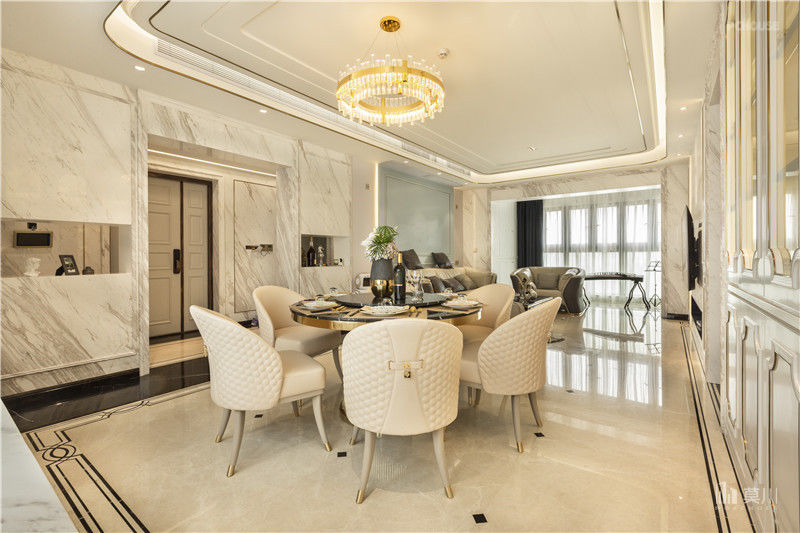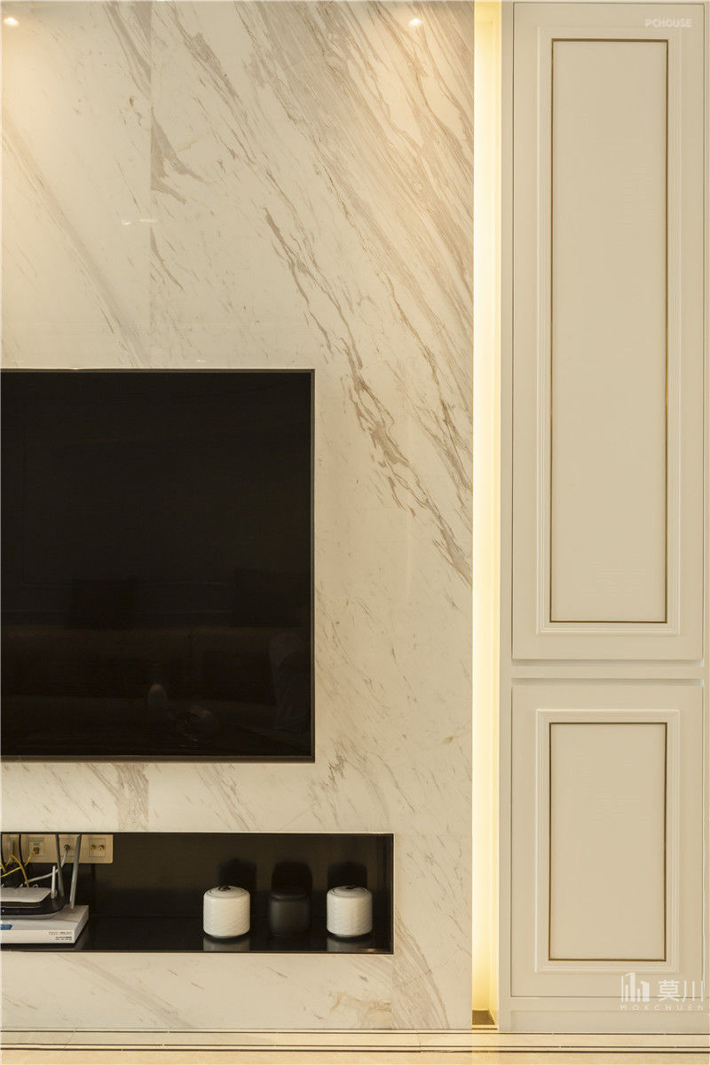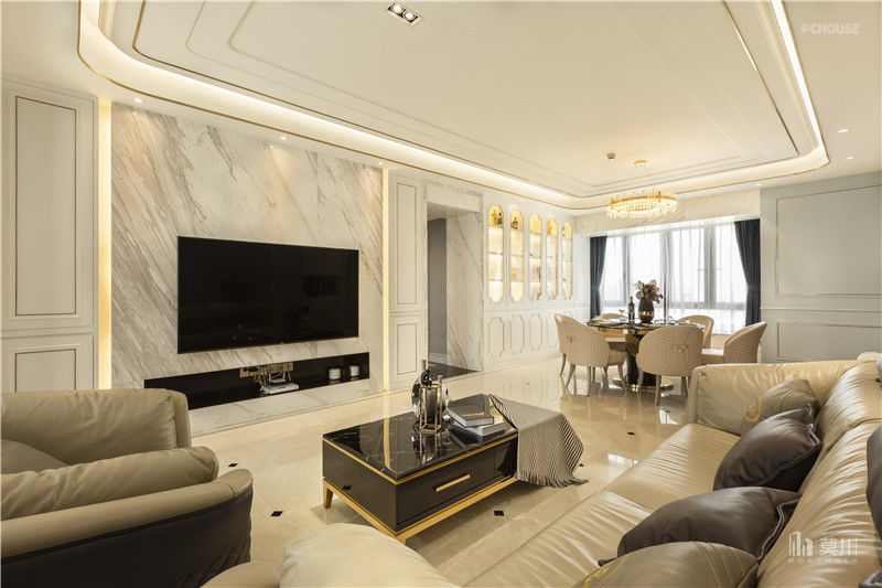 客厅及餐厅背景墙改造成柜体装饰一体化设计,即是造型又是暗藏式储物空间 。客厅墙面灯槽设计使得空间层次丰富而又不失格调,使得空间主次分而不离#客厅 #电视背景墙 #沙发