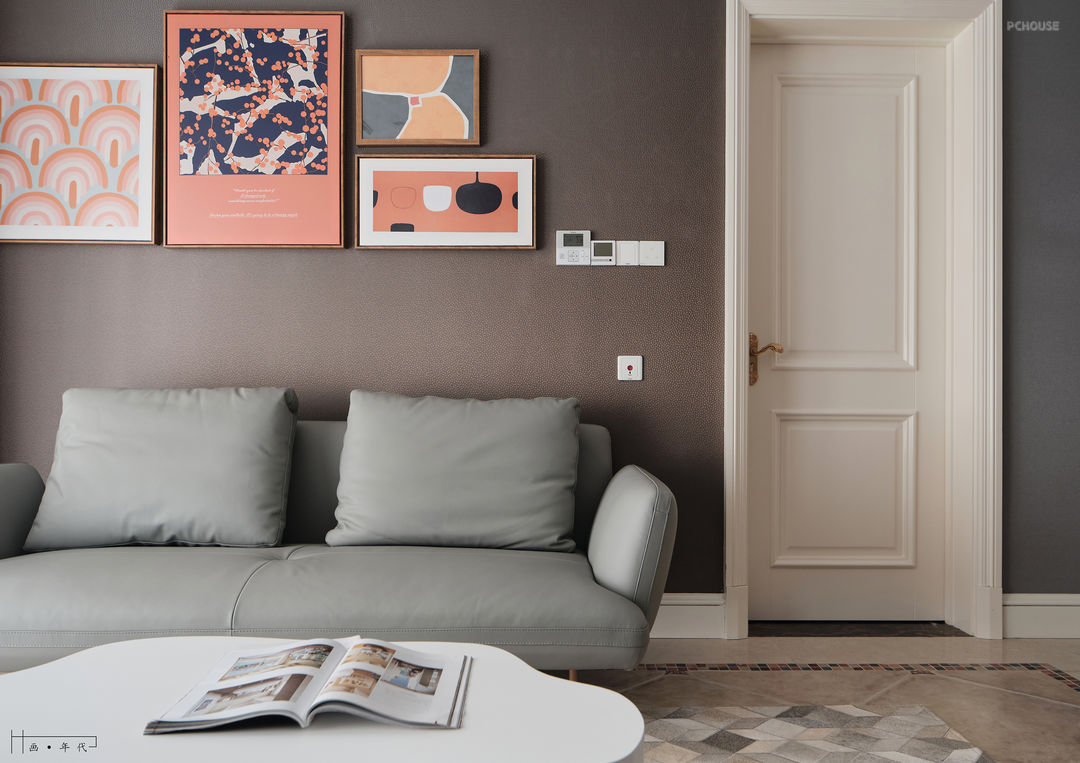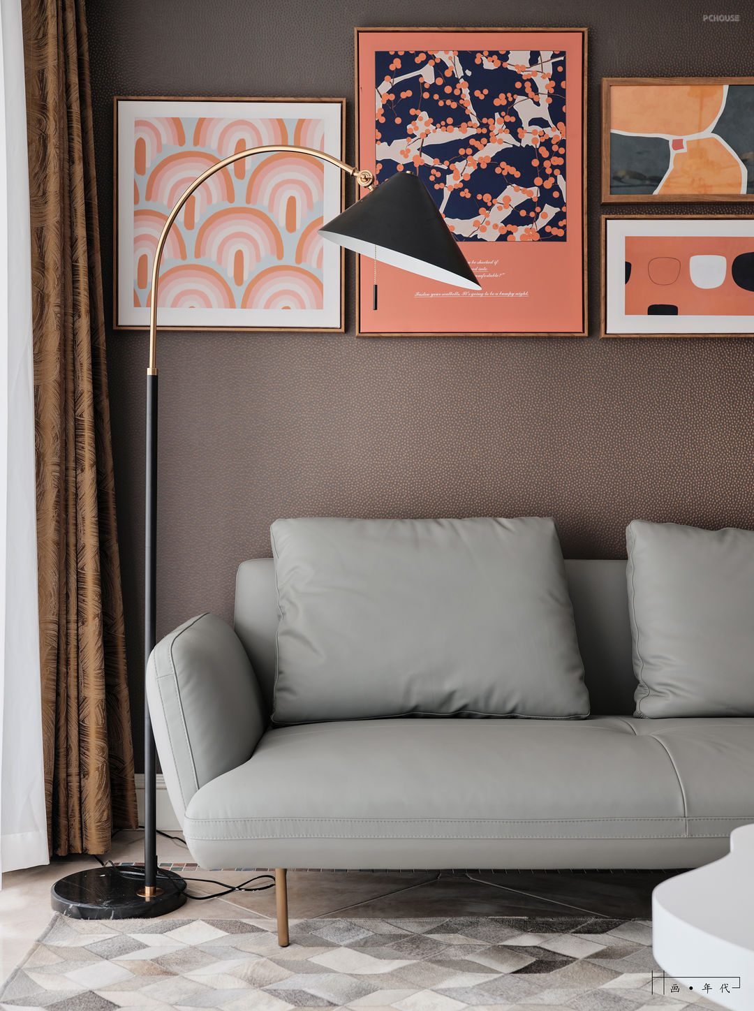 沙发背景墙用暗棕色带有肌理感的墙布打底,艺术感的装饰画在传述着,屋子的性格——我可以很稳重,但是不影响我活泼。