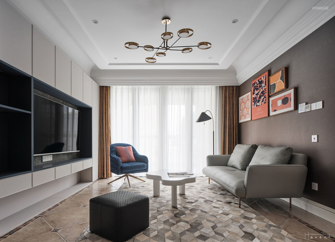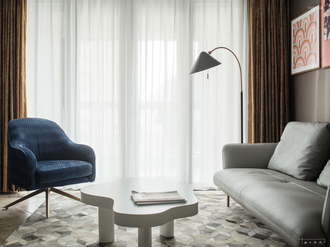 蓝色的休闲椅,橘粉色的挂画,暖黄色的窗帘,冷灰色的沙发,绘成了深秋的美景。