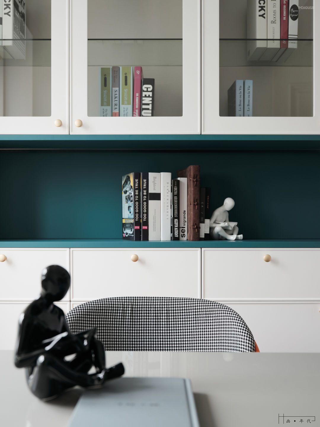 用柜体作为电视机背景墙,大面积的暖白色,局部用蓝色来点缀。干净利落的背景不仅美观,还有强大的收纳功能。