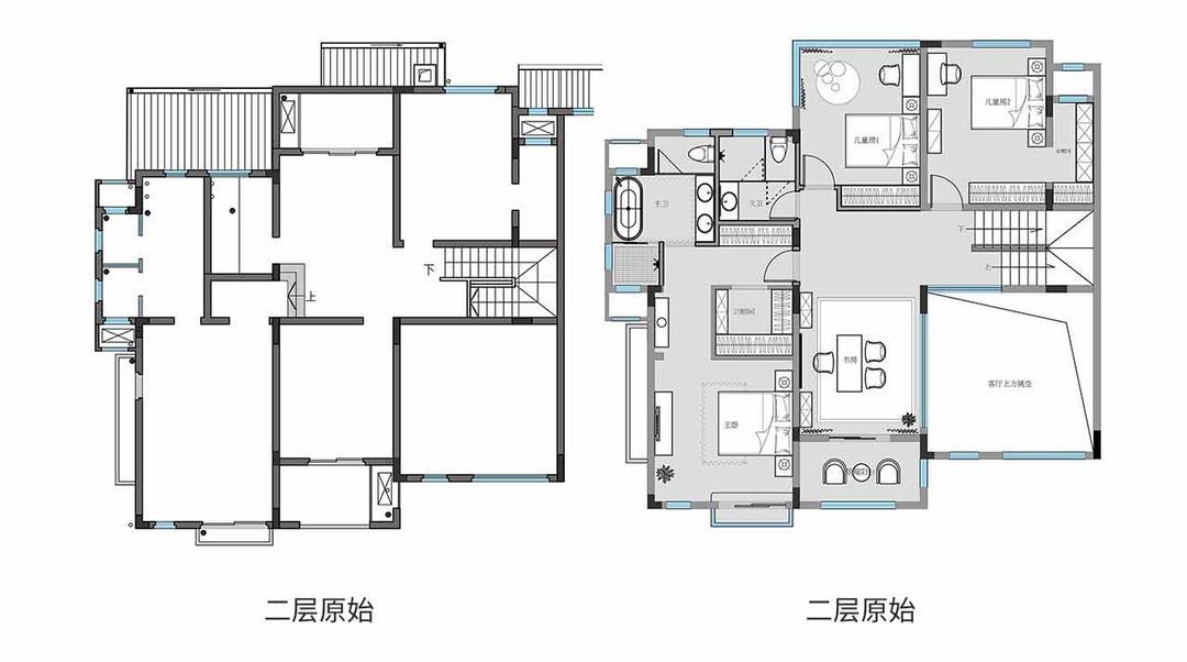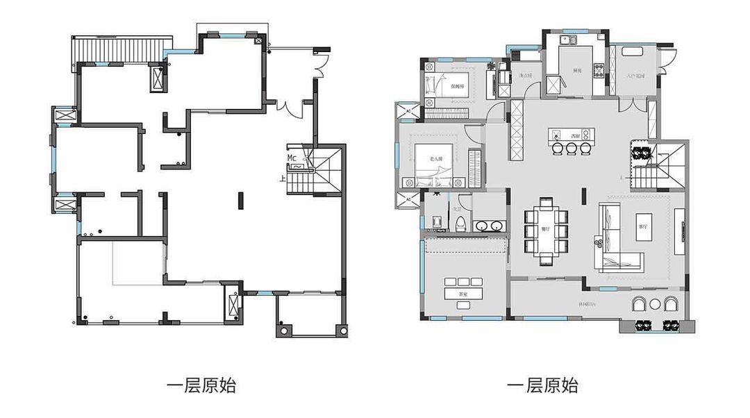 面积比较富余的顶跃户型,该有的功能格局都有。一楼原始局部比较局促,功能空间利用不充分。二楼集中的卧室空间,需要集中考虑生活细节的实用性和动静分区。
