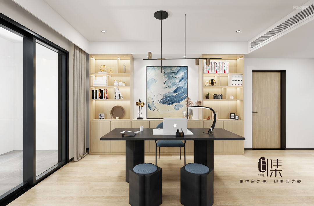 原木色与冰川灰的巧妙组合,配合简洁有力的线条,一切变得干净简单。配合原木色格栅板,空间立体层次凸显。不多不少,设计语言用的刚刚好。