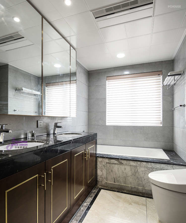 以蓝色鎏金细口花瓶点缀,大理石、黄铜等材质的大量应用固化着整个空间的质感格调。