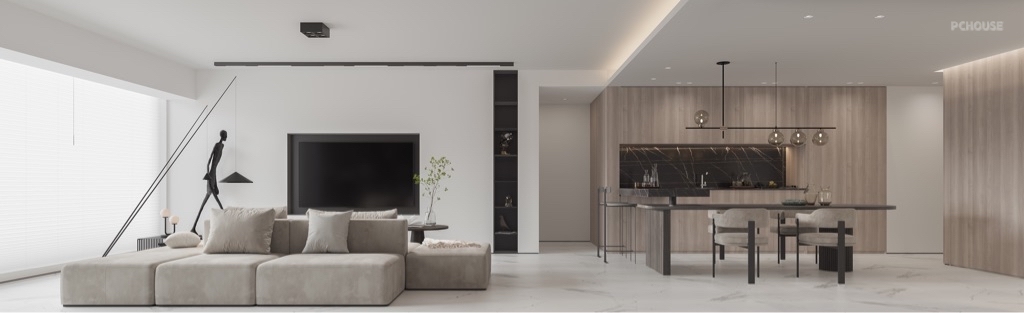 前言: 关键色彩:木色、白、黑<br>黑白色、直线造型,是打造都市新贵之家的捷径——黑与白的强烈对比呈现出干净的空间,没有花哨的颜色,显示出居住者出世的清雅。石墨灰,以重要的辅助色出现,与白、木色做组合,给人以山水浩浩汤汤的联想,更显居住者心胸广阔、坦荡磊落之意。