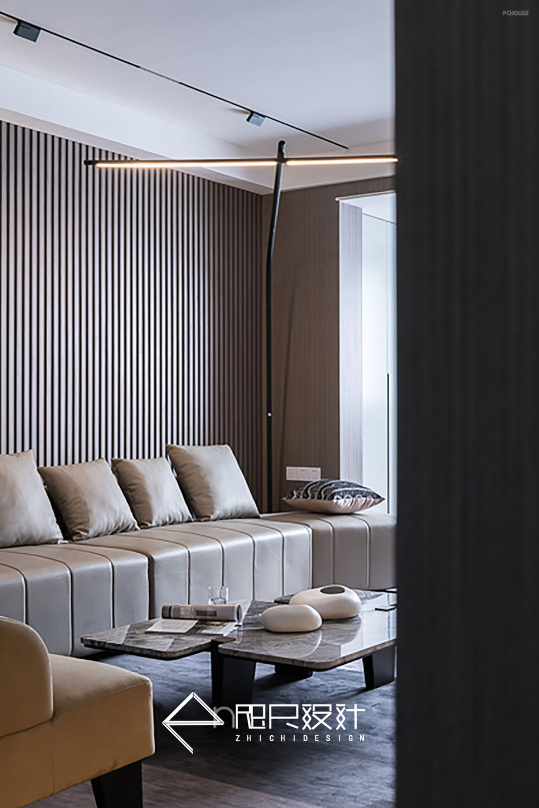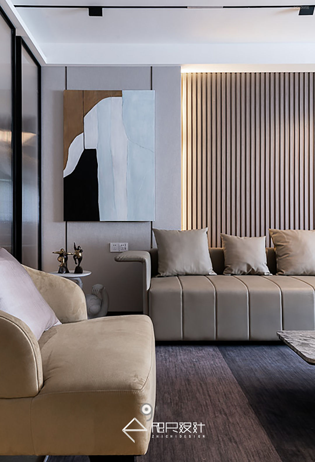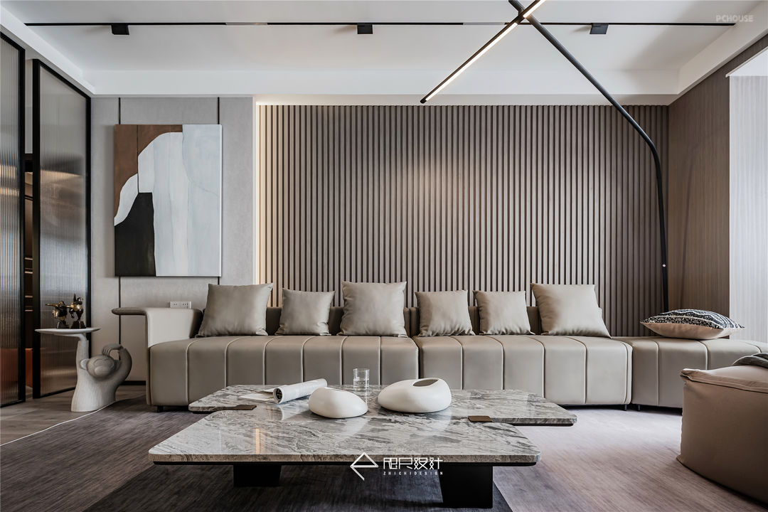 多人位的皮质沙发,满足日常待客需求,沙发后间隔十公分处,打造木格栅背景墙和隐形灯槽;