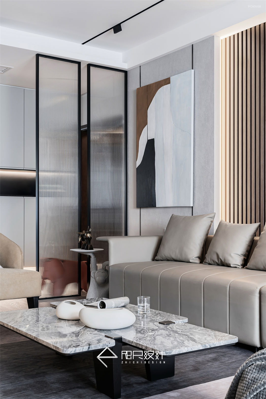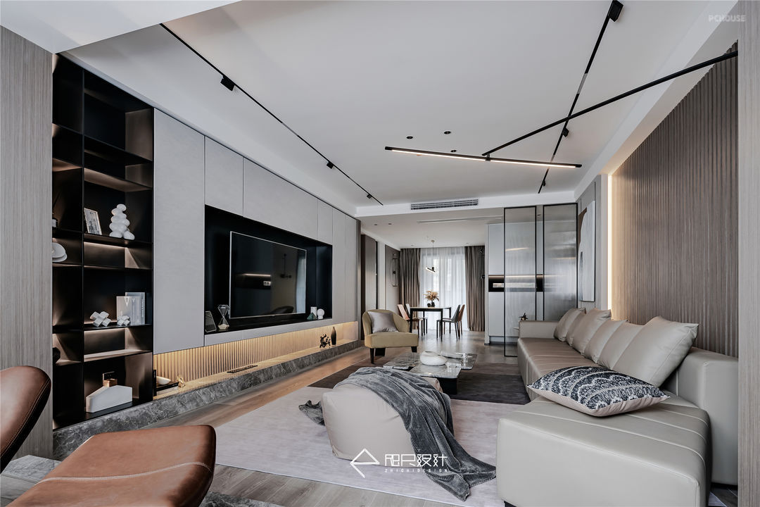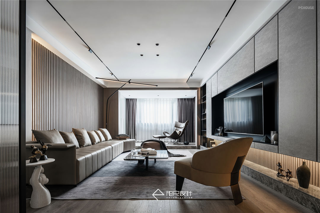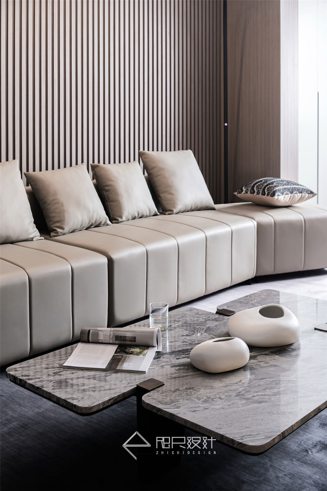 多人位的皮质沙发,满足日常待客需求,沙发后间隔十公分处,打造木格栅背景墙和隐形灯槽;