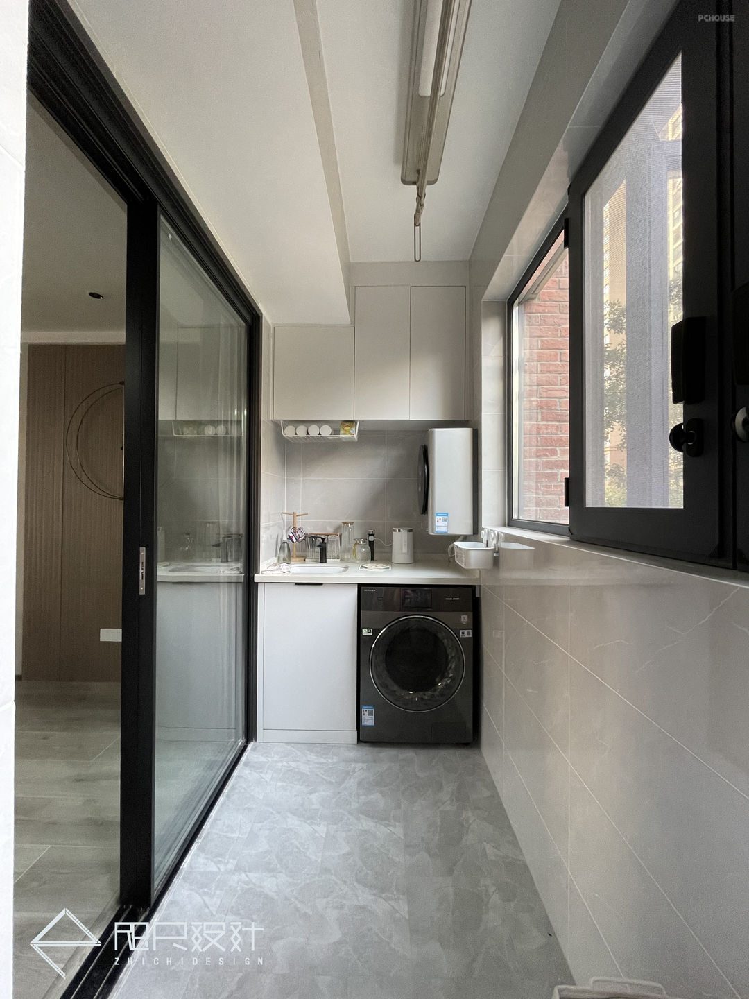 原北阳台十分狭窄,往餐厅扩宽约四十公分左右,打造家政区和存放洗衣柜的位置。