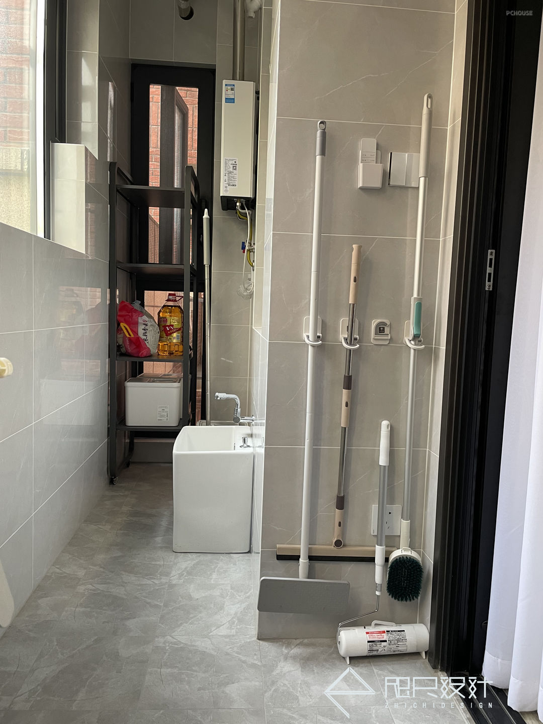 生活阳台原先十分狭小,没有图一中存放清洁用具的地方,后在保证餐厅面积合理的情况下,将生活阳台往里扩宽了约四十公分,才有了多余的地方,如图二去置放洗衣机。
