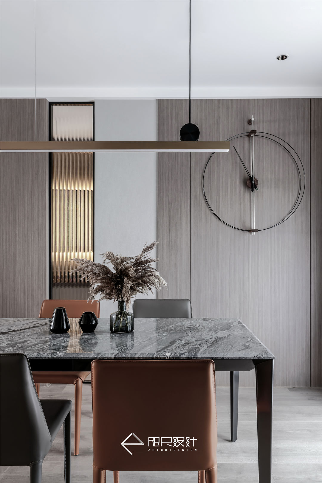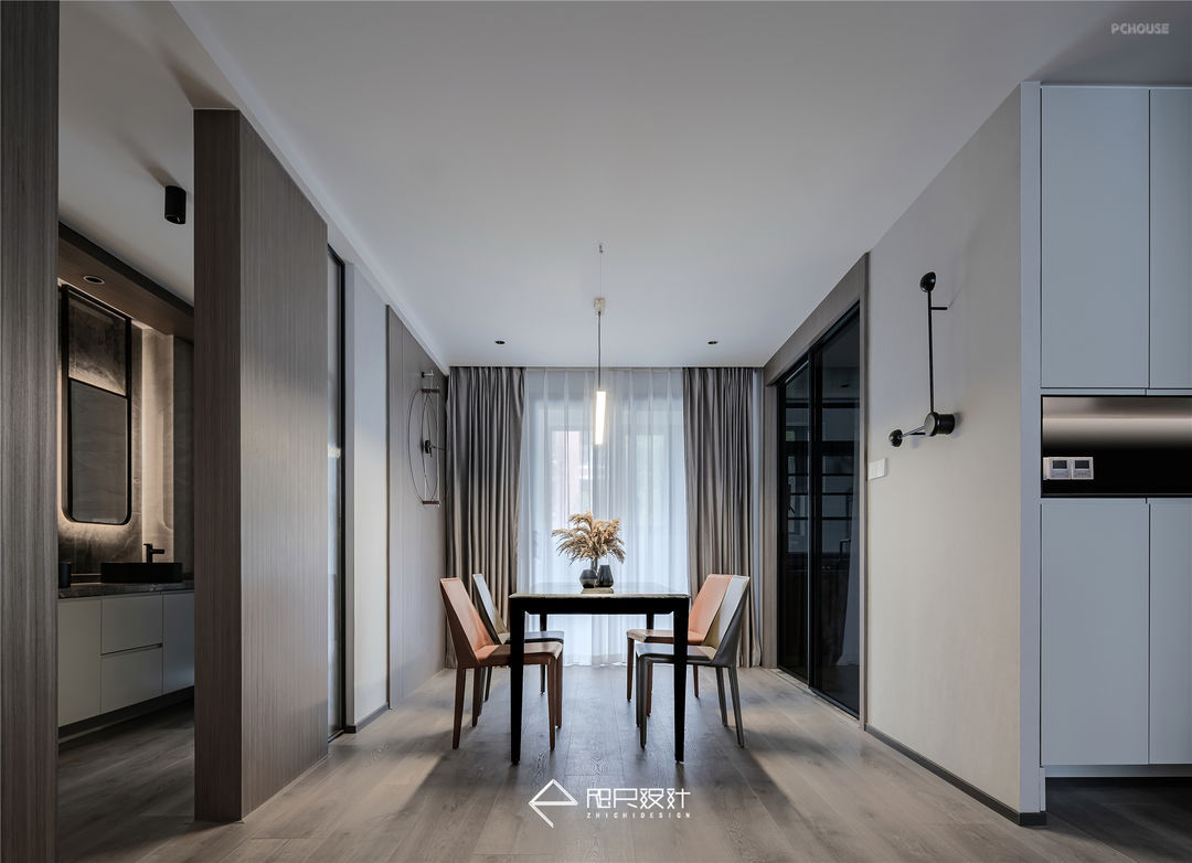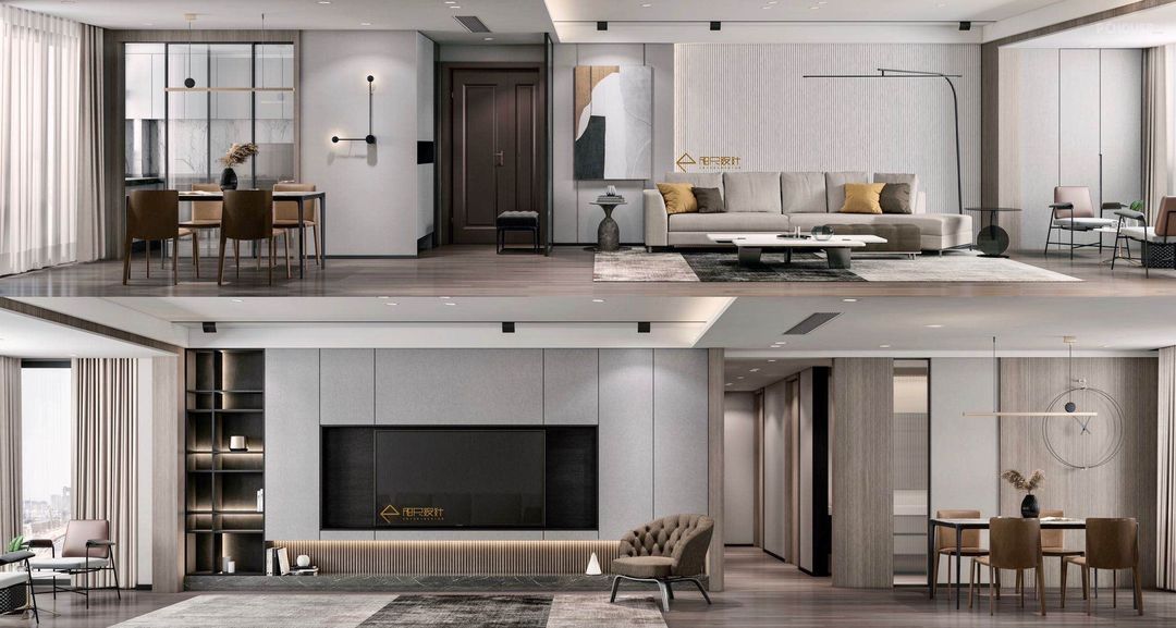 这是一个由不锈钢、大理石和木饰面、墙布组成的现代轻奢风空间,用无主灯和磁吸轨道灯进行照明,提高家居空间的质感档次,打造出通透明亮的视觉效果。