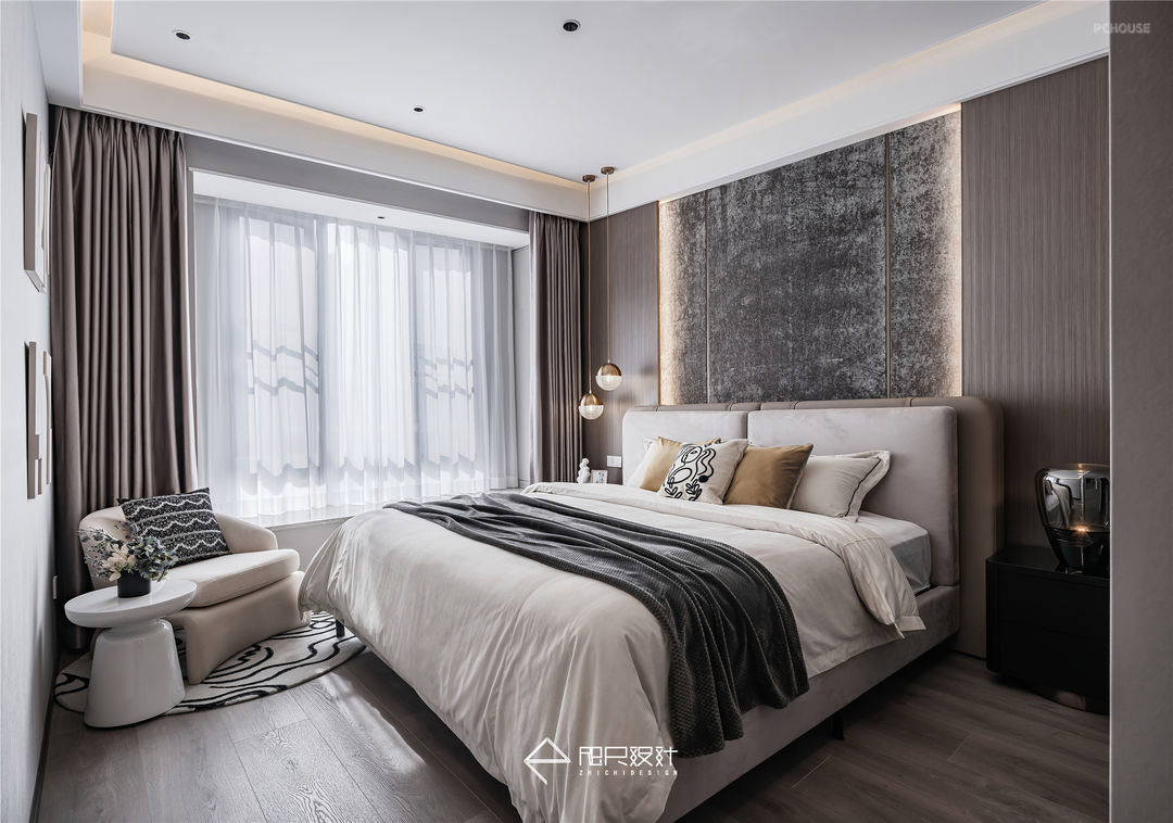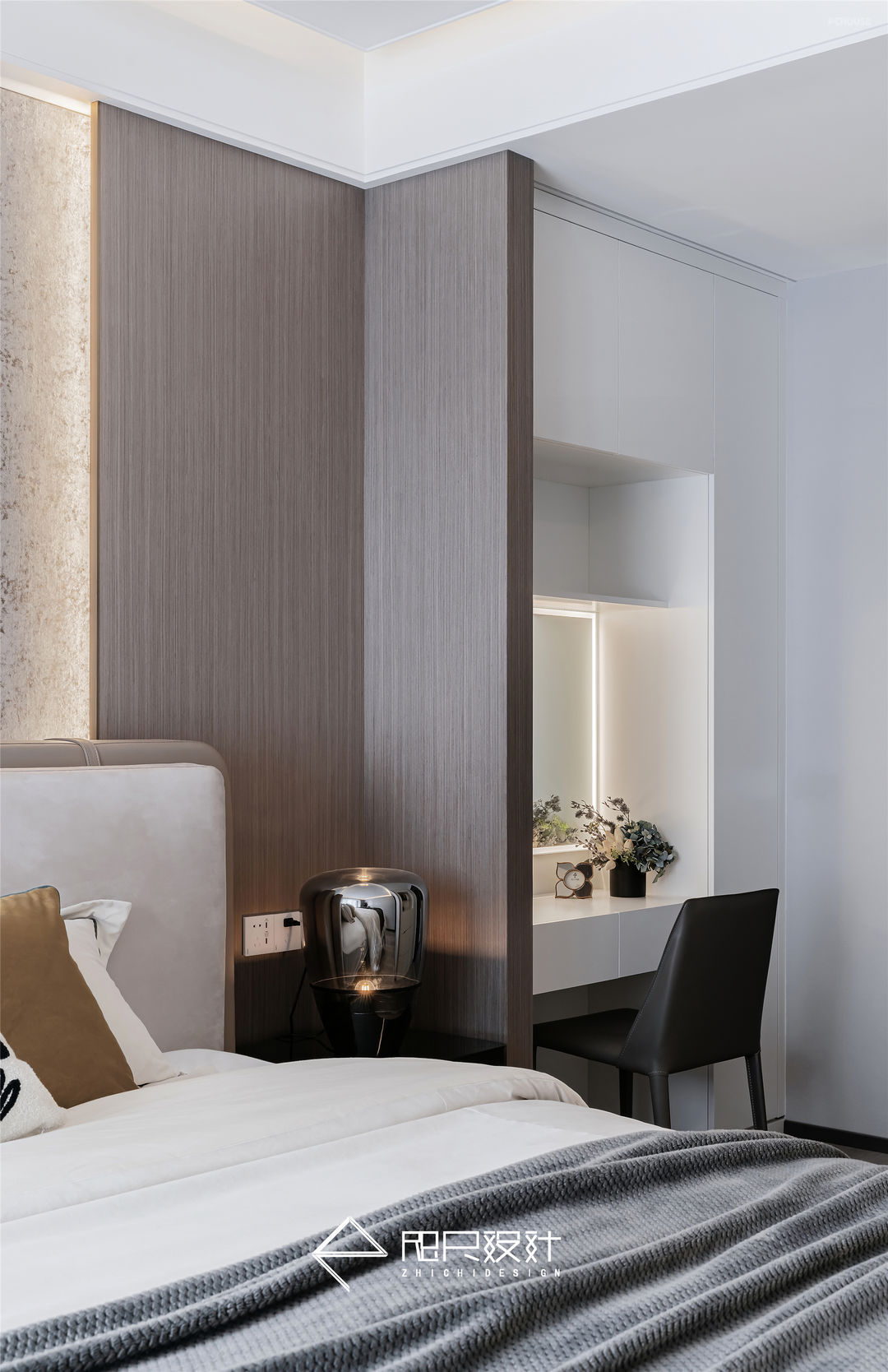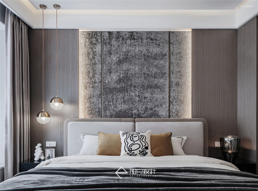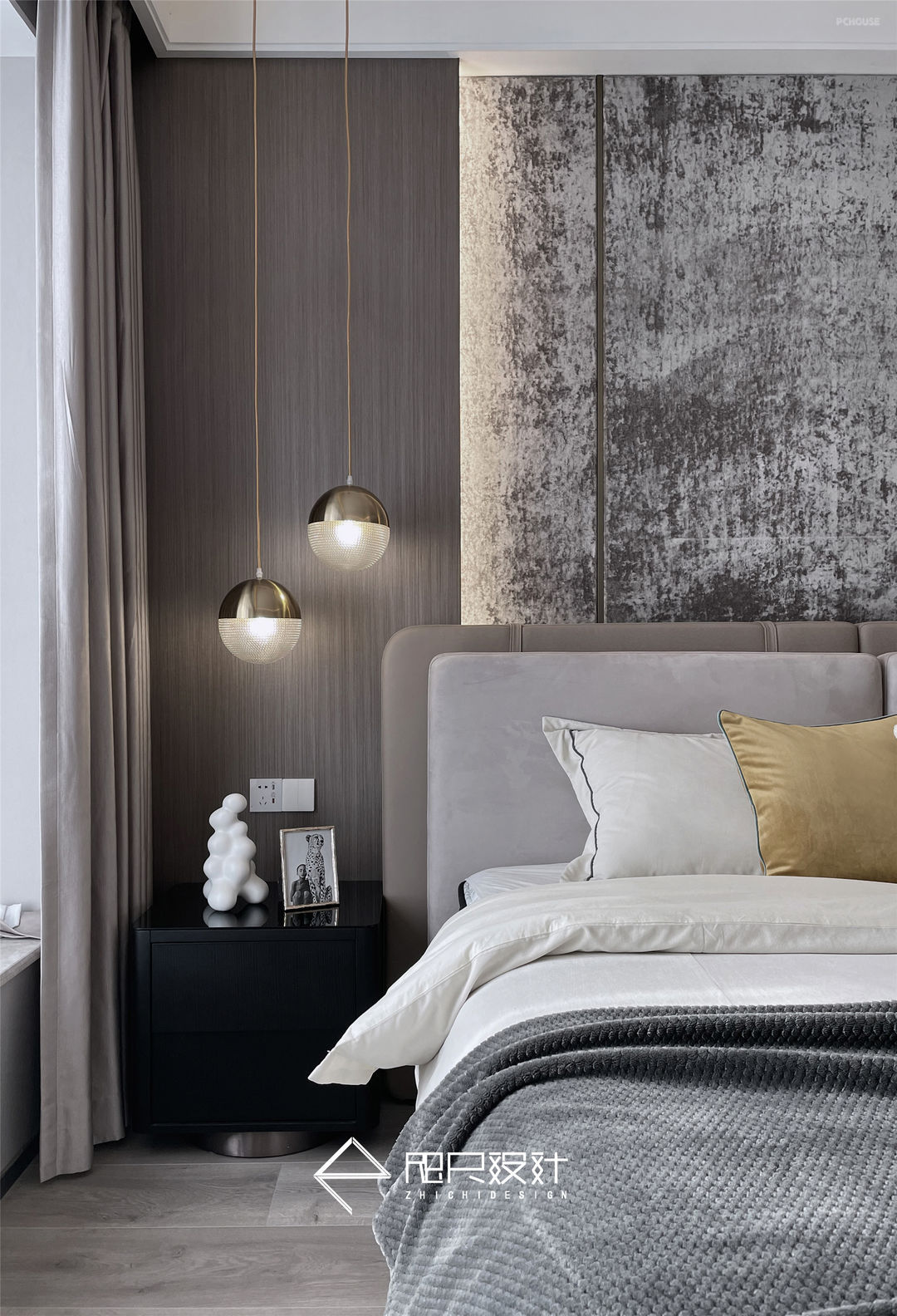 主卧是卧室+衣帽间+卫生间的大套间,绒布包裹的床头背景墙触感柔软,在灯光的映照下,是直“撩”心底的优雅;