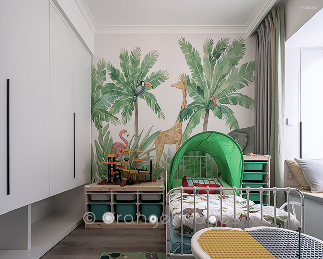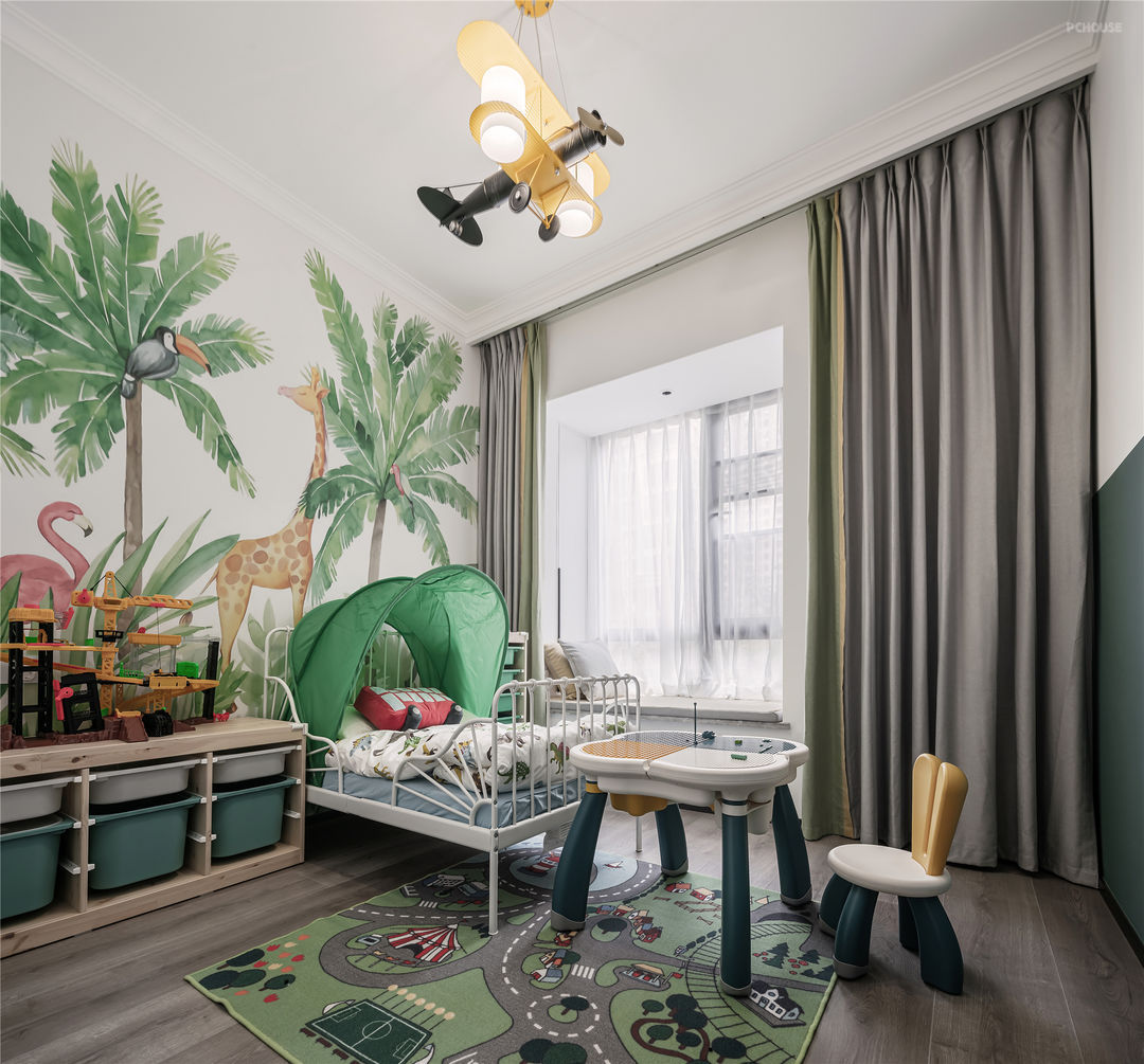 儿童房除了森林壁纸和飞机模型灯是设计师选购,其它都是由妈妈亲手布置,满满都是对宝宝的爱意。