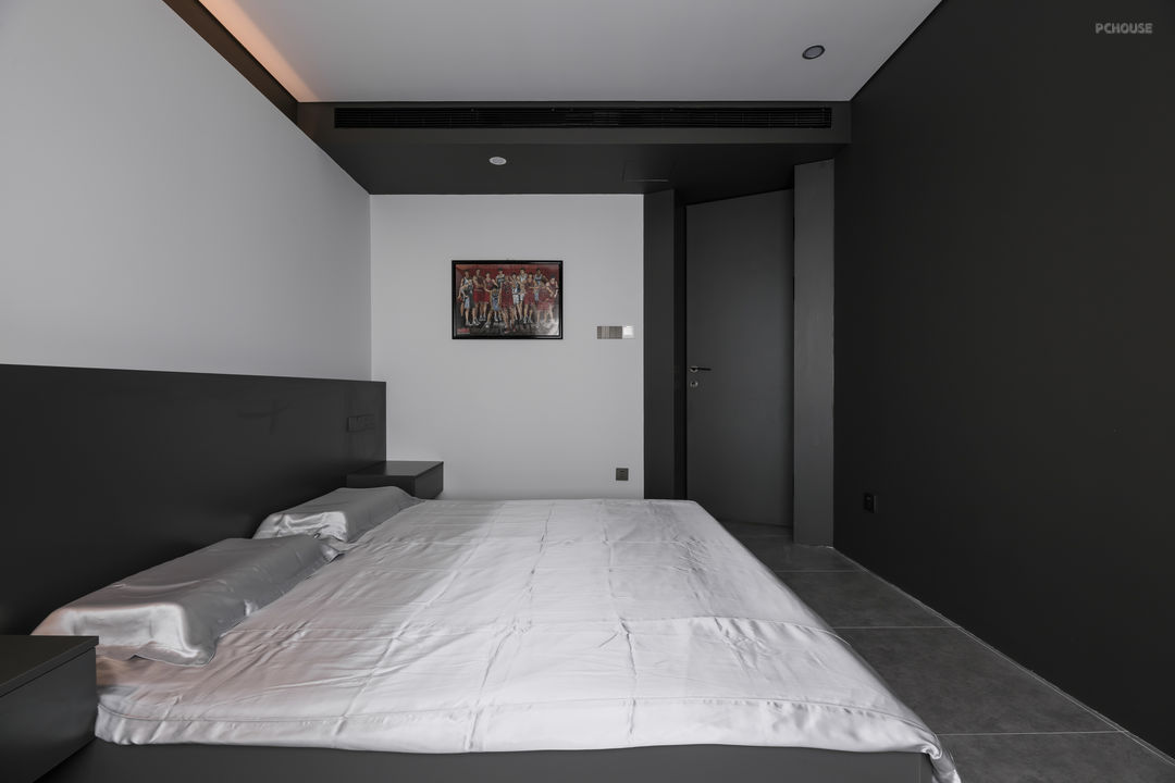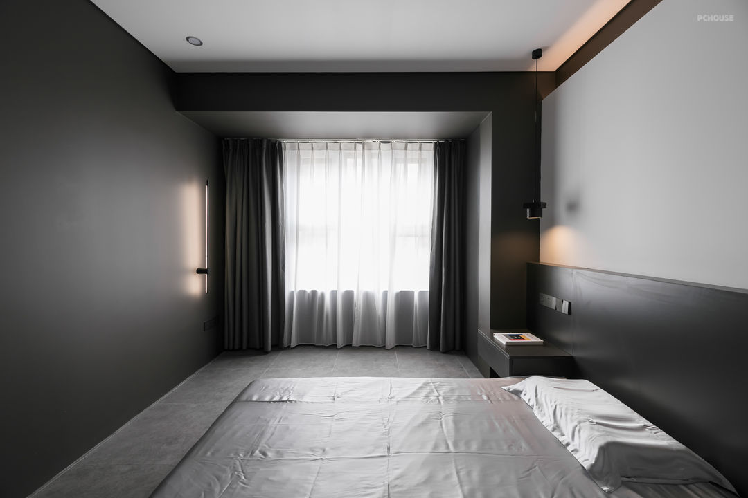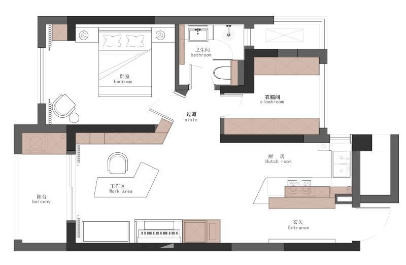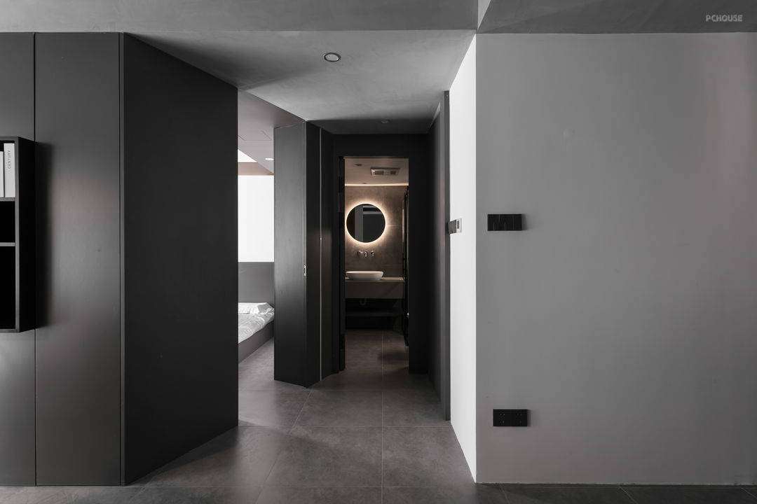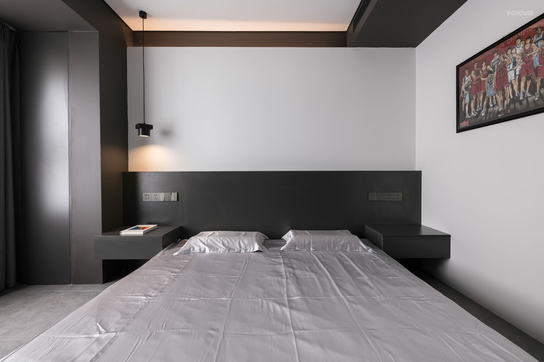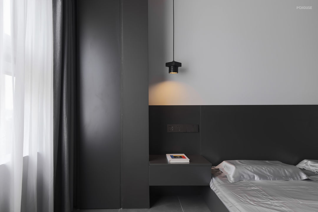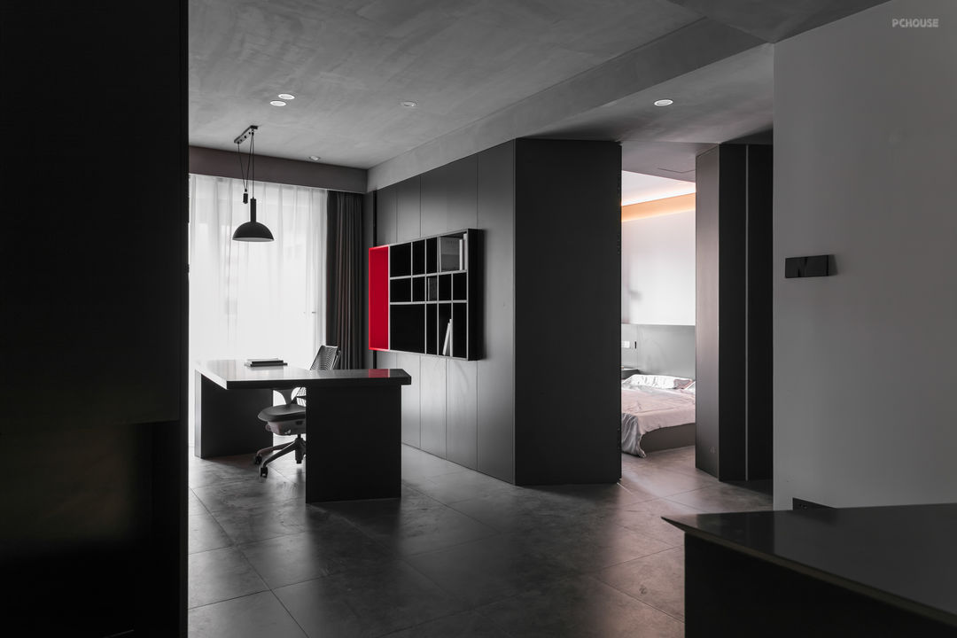 从平面布局上看出.没有传统式的客餐厅.将书房作为整个公区的重心.将书柜墙体做了转折.让卧室.卫生间和衣帽间之间的交通枢纽变得更为宽阔.