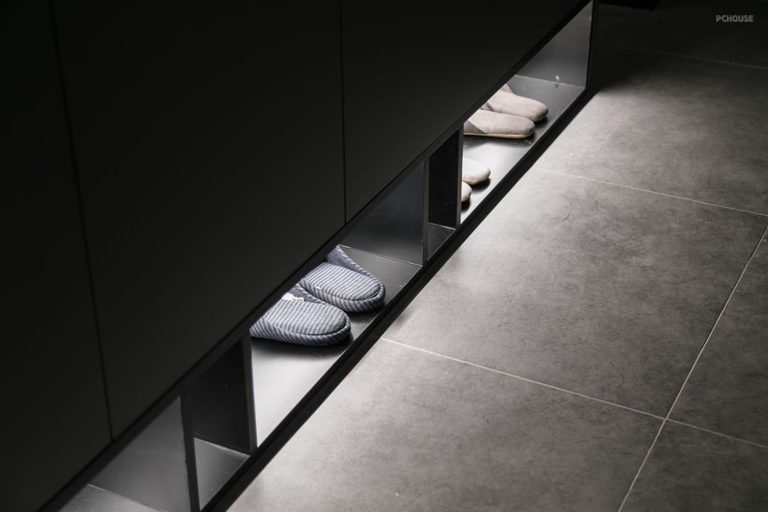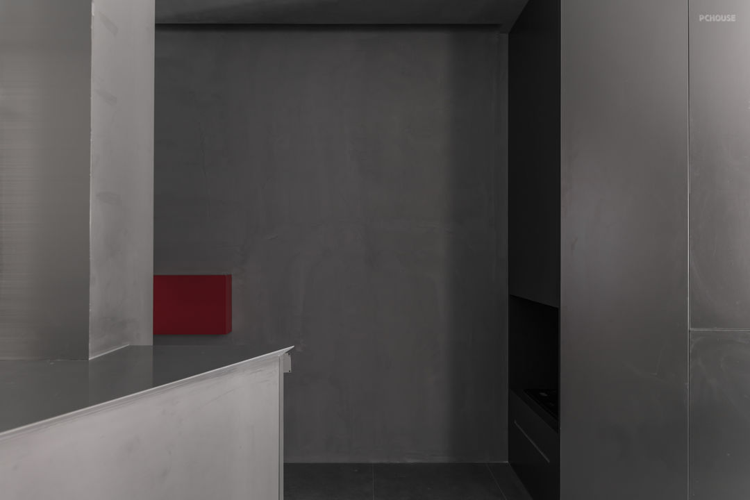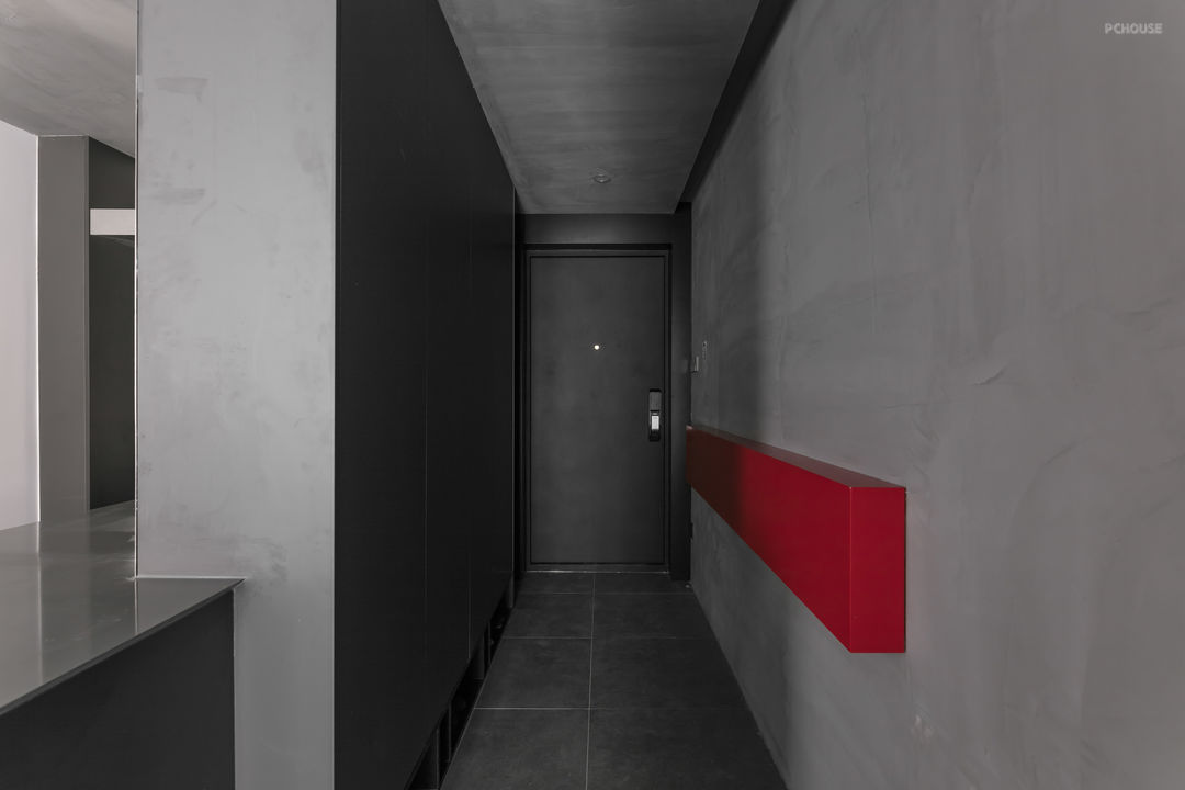 玄关与厨房.我们用了一组顶天立地的柜体来做隔断.满足双侧收纳的使用需求.红色体块可以随手放置钥匙之类的物品.同时也是一种装饰.