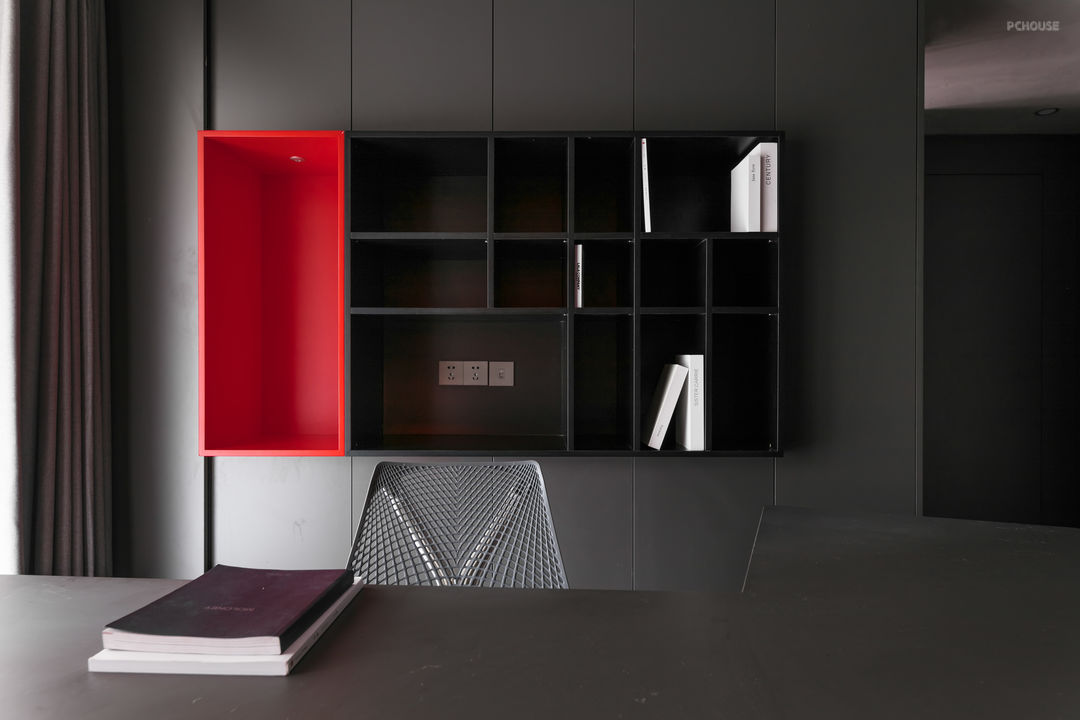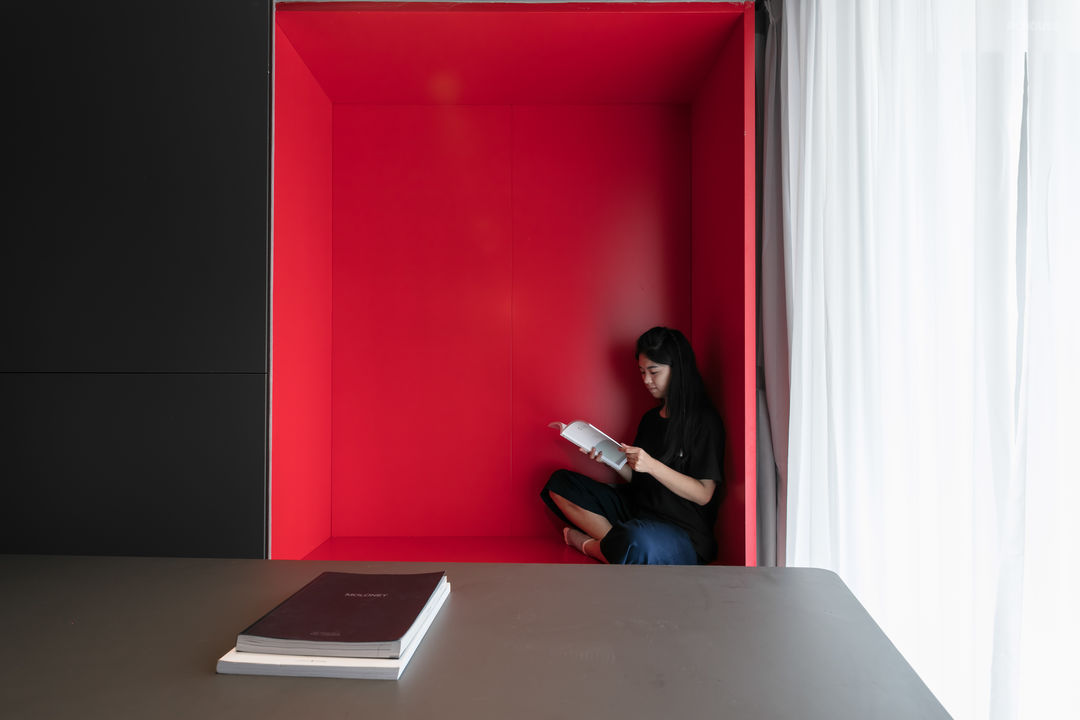 跟柜体一起,我们做了一个红色的BOX.偶尔还能代替沙发,坐在上面阅读.