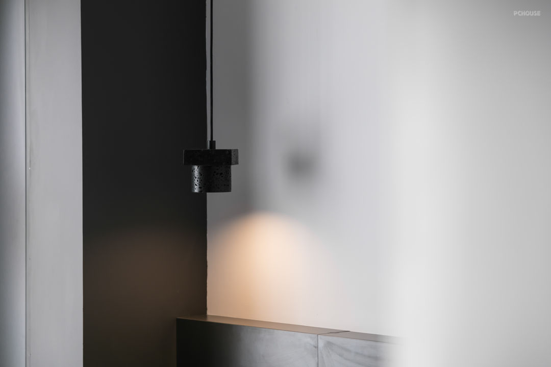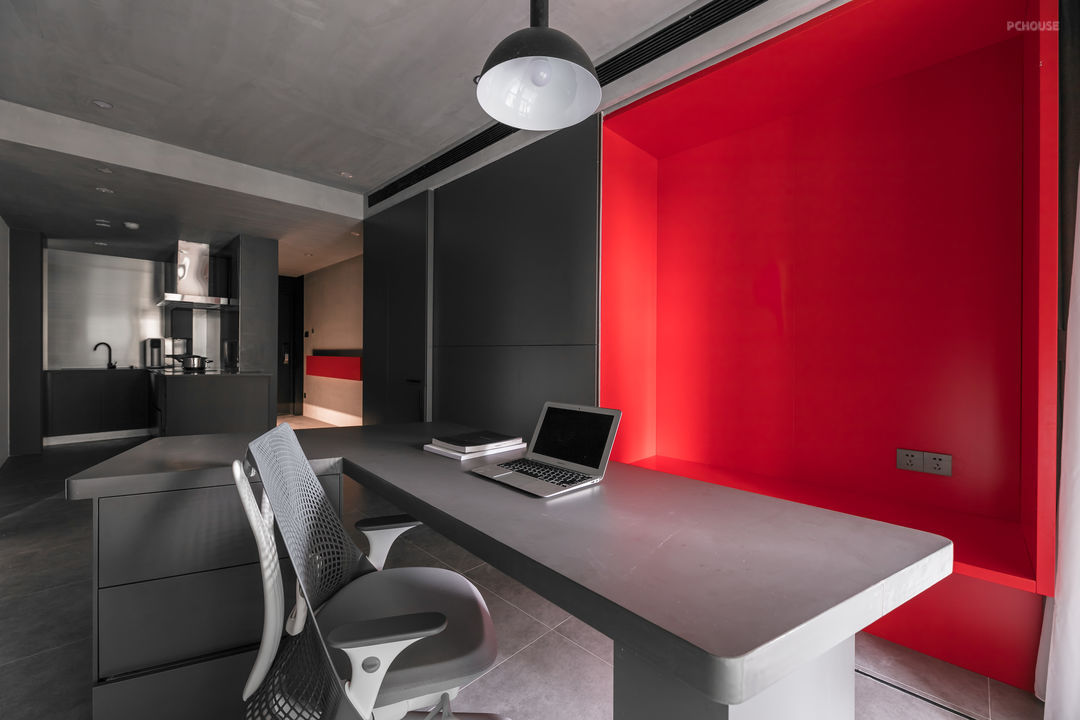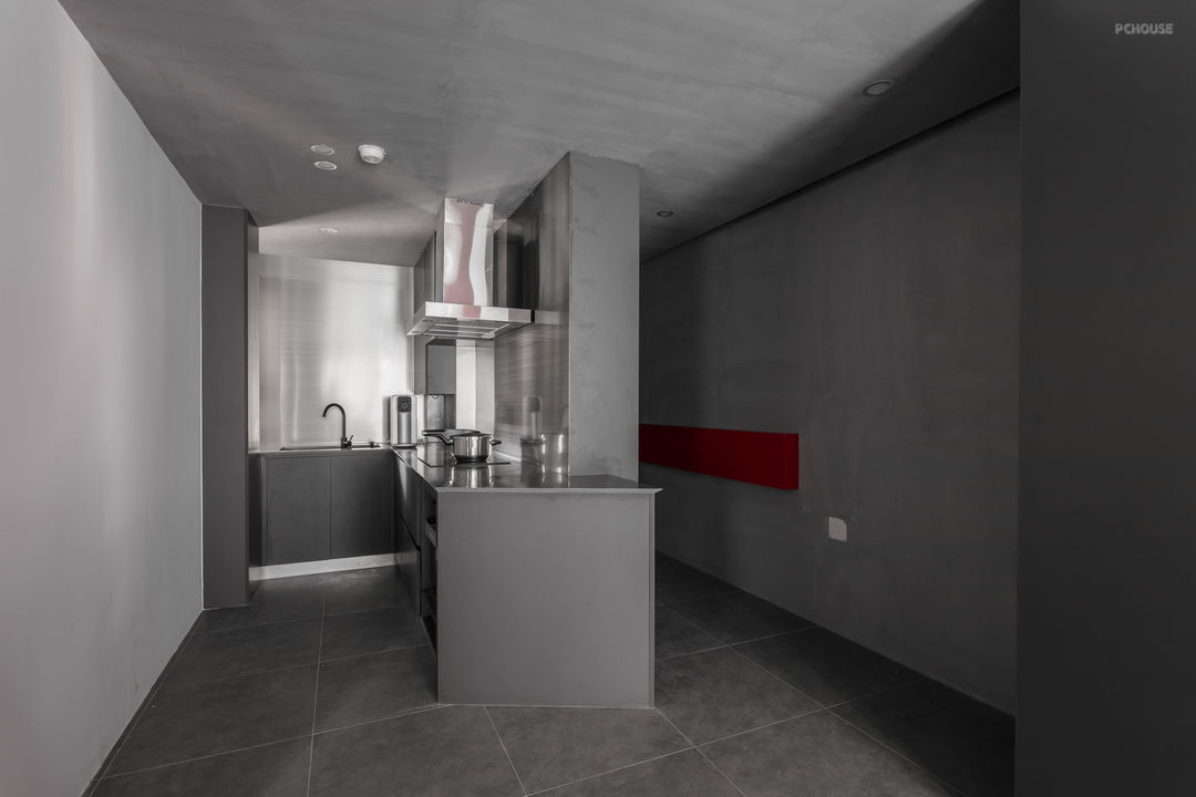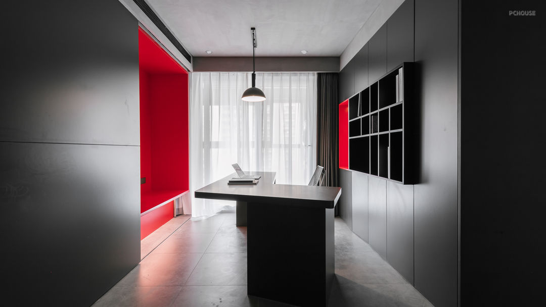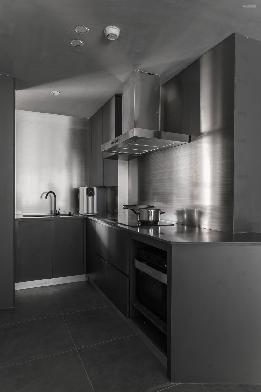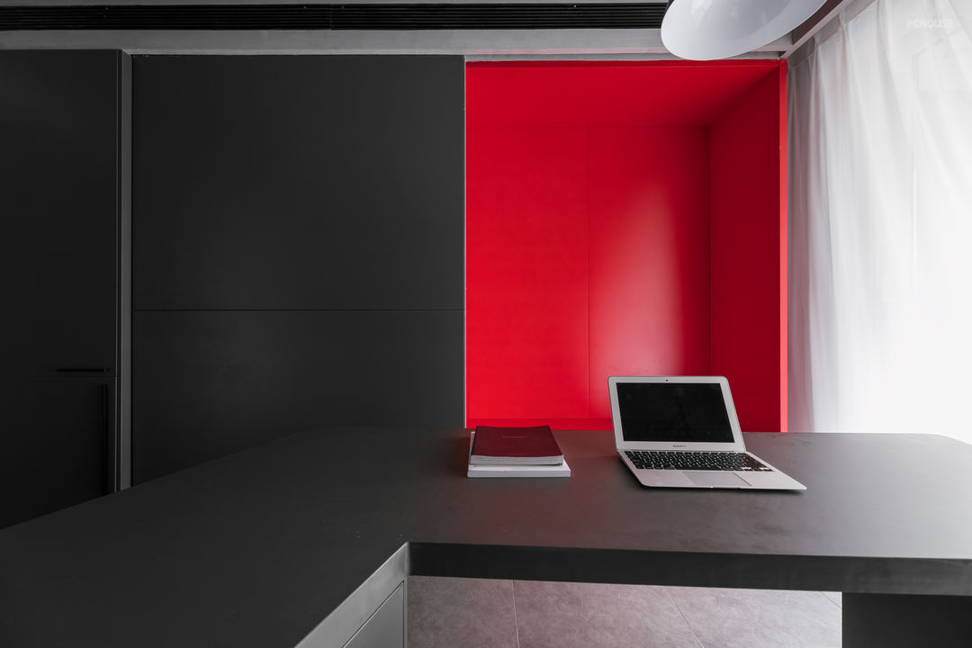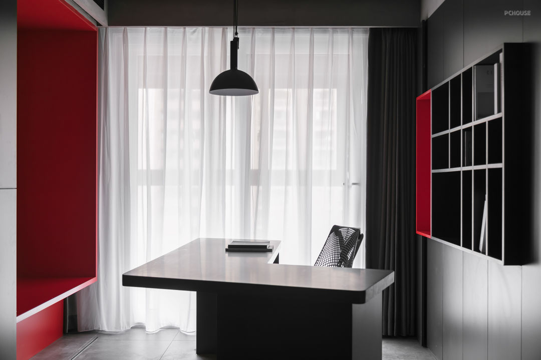 平时业主在家办公时间较多.所以没有采用传统的客餐厅的形式.我们在公区只做了一个厨房和书房.甚至我们都没有要餐桌.因为生活很简单.书桌偶尔可以替代餐桌的功能.