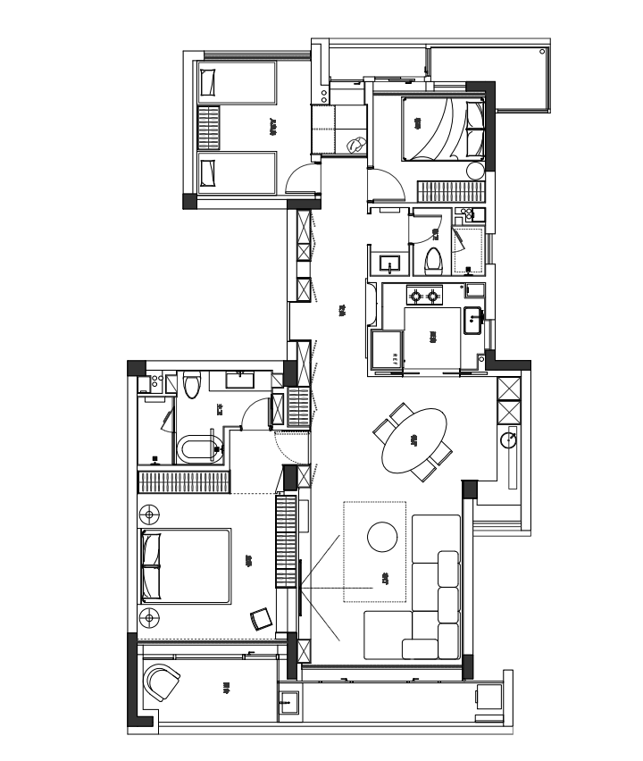 一整面落地窗足以满足室内的采光,而且整个客餐厅的公共空间本身很富余,所以阳台没有选择包进来。考虑到双胞胎的活动玩耍主要在这个空间内,我们软装上并没有做过多赘余的东西,四个可自由组合的沙发,一把茶几和边几,给他们足够大的可发挥空间。