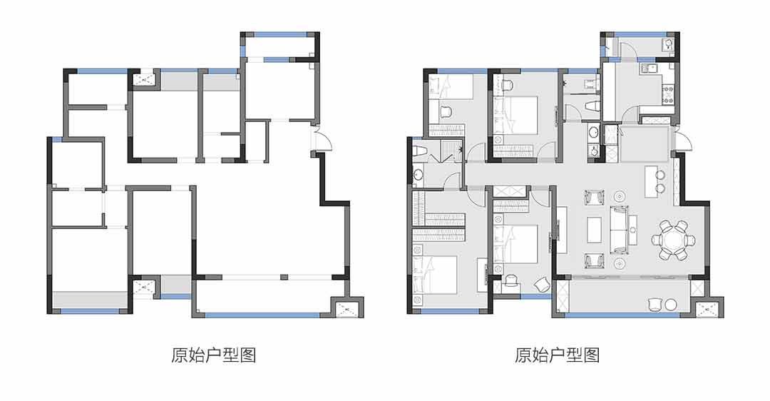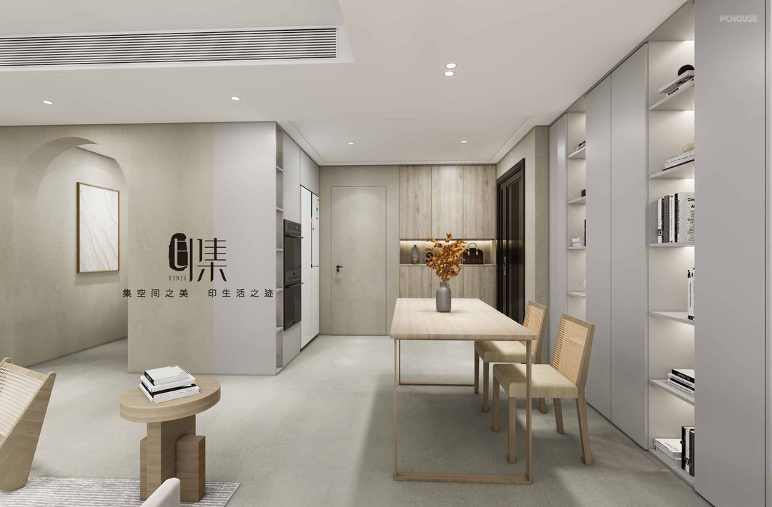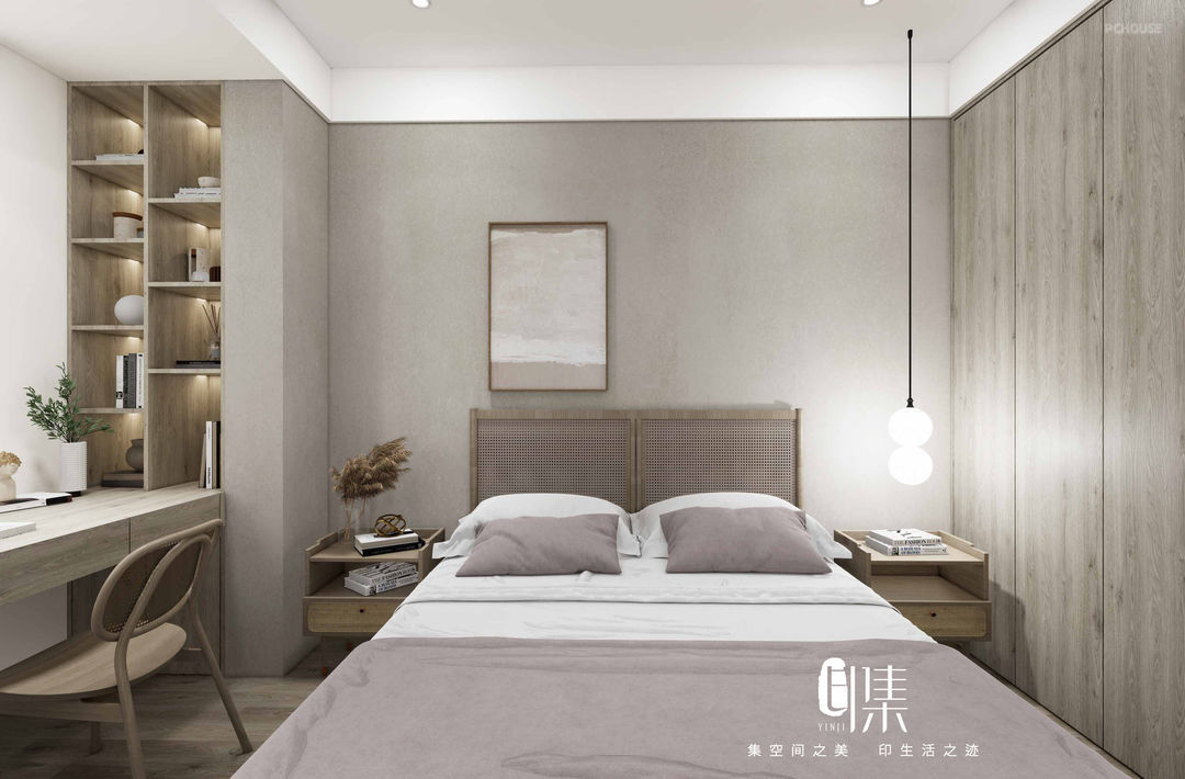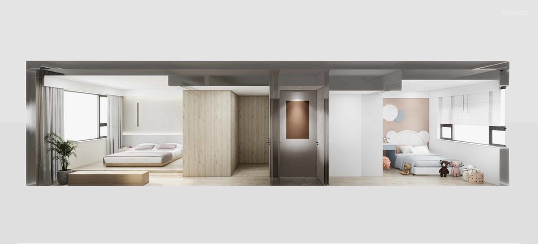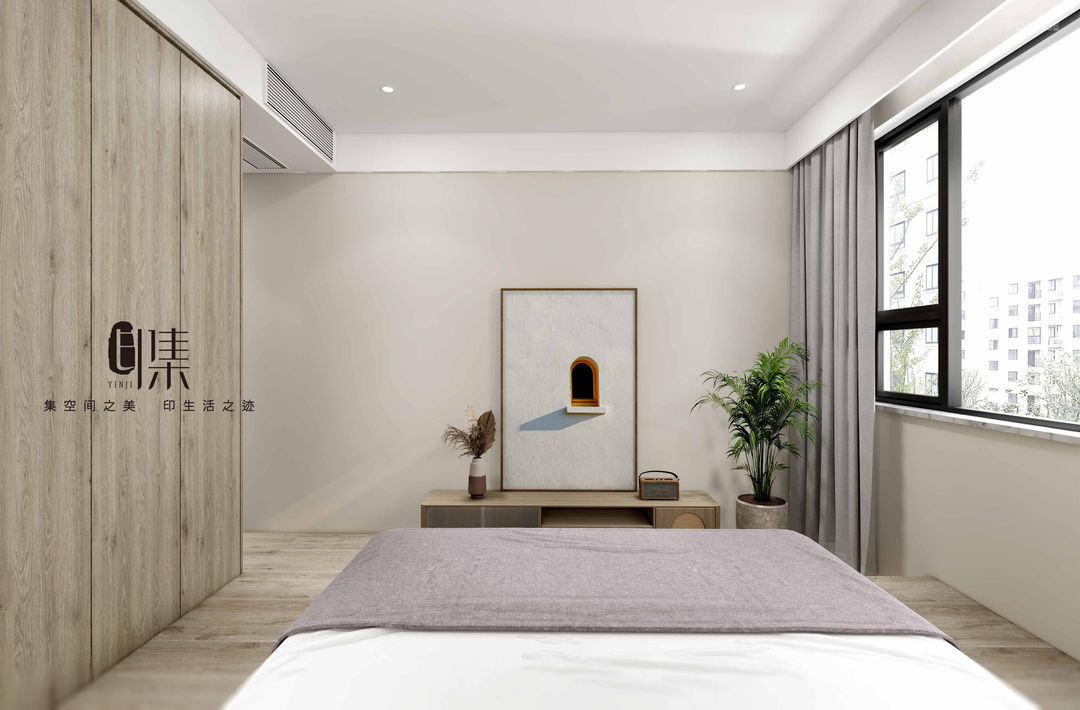 本案例户型方正,房间数量较多,能满足业主杨先生的家庭结构,但次卧房间面积对将飘窗全部打掉做修复,能够使空间最大化,便于活动与利用。由于家中有两个孩子,因此在不影响侘寂风的整体效果呈现下,尽量多收纳。