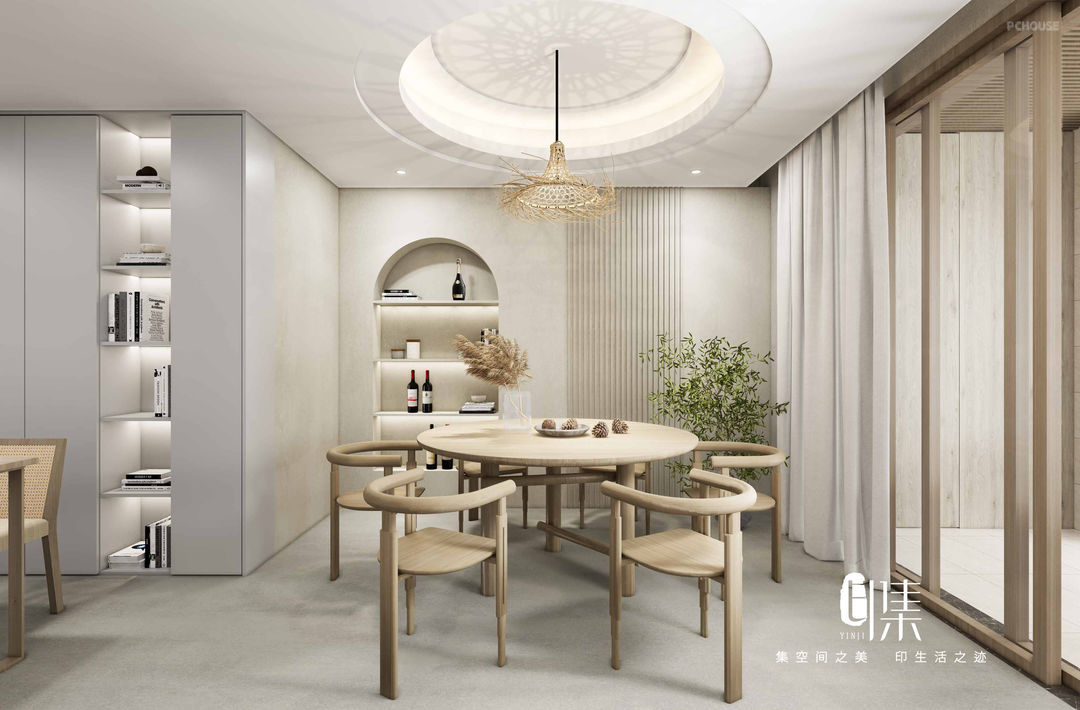 藤编元素吊灯与餐厅吊灯相呼应,返璞归真的美感油然而生。