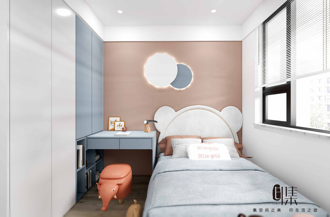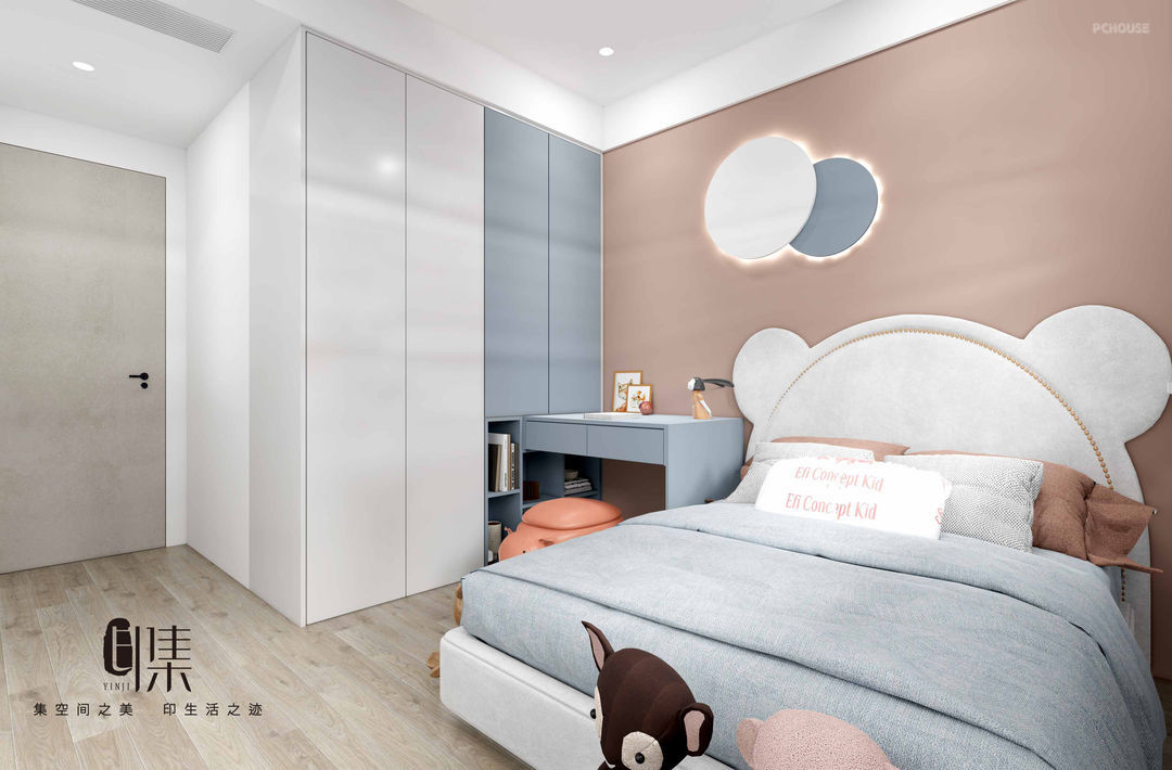在侘寂风里面几乎很少出现明度或者纯度很高的颜色,大体用灰白色、米白色、大地色系作为基础色。这些色调多取自于自然,为的是尽可能保持材料的原本质地;儿童房加入暗粉色和浅灰蓝,能给整个方案带来一丝活泼。