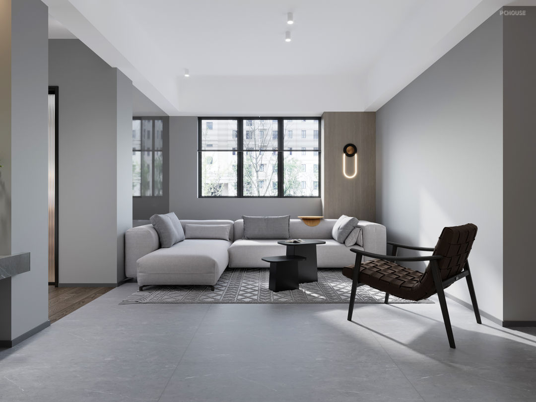 客厅没有做过多的装饰,以白色和灰色为主基调,营造出宽敞明净的空间氛围。