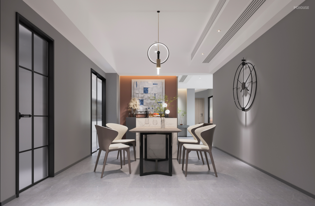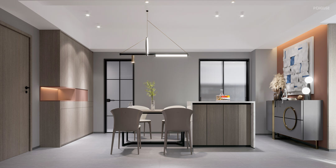 餐厅布局简洁不失格调,不仅每日三餐的必要场所,也是以后一家人谈论家庭乐事的地方,精致的餐桌和吊灯让食物都感觉更美味了一些。