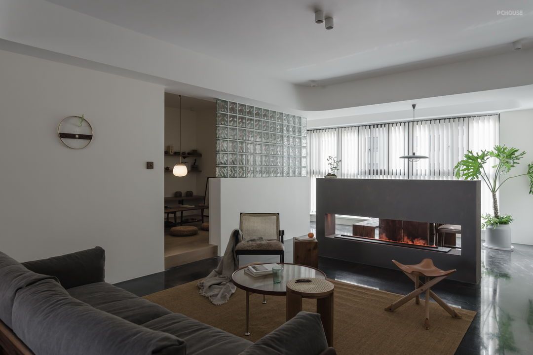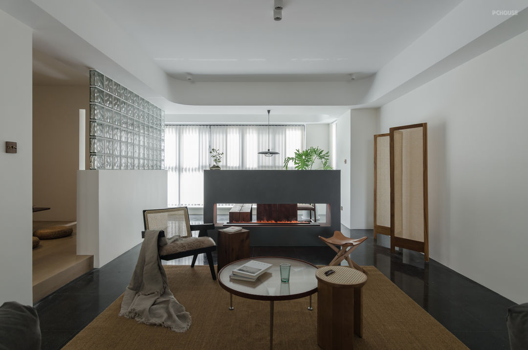 ▲壁炉隔断界定出阳台茶室与客厅功能,实现两个区域的缓冲以及功能的独立。