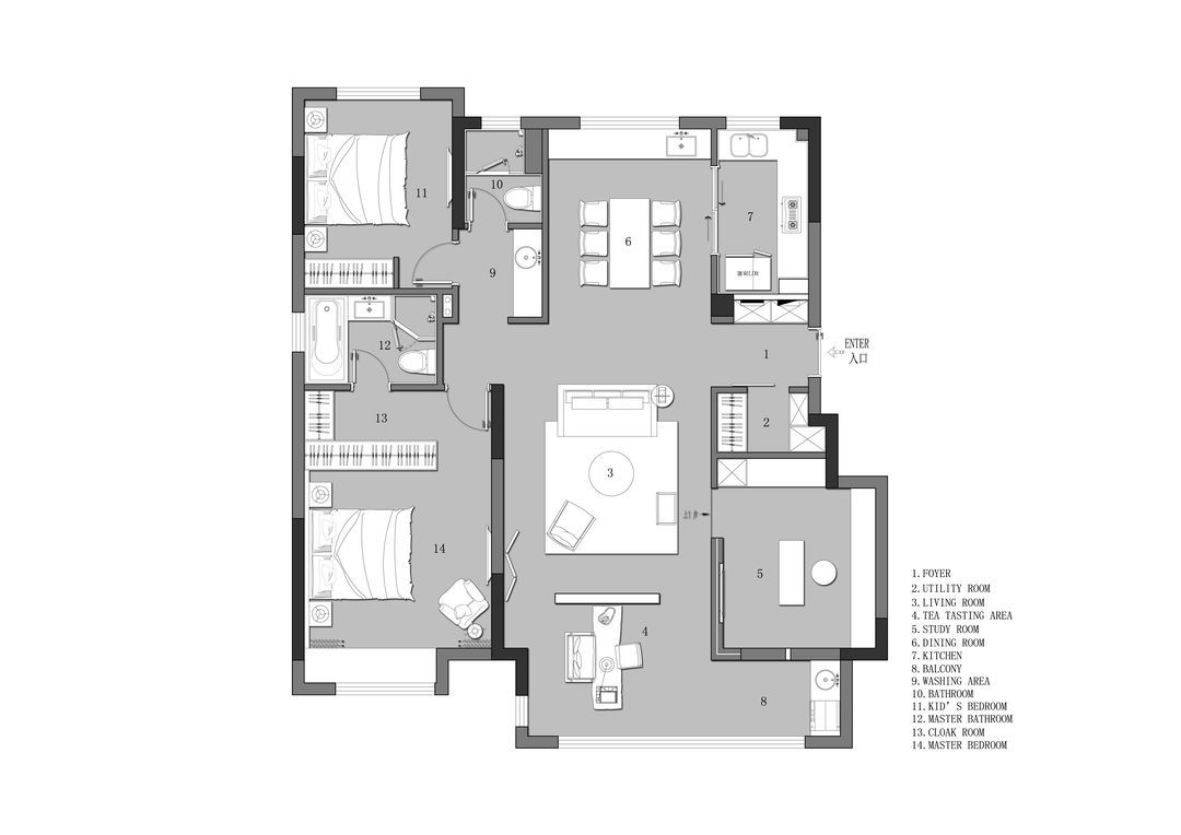 平面布置图。新的方案结合了业主需求,将原始客厅布局打破,摆脱了以“电视墙”为核心的传统客厅布局,围绕壁炉设置了隔断墙,重新划定了客厅中心,形成了阳台茶室+围合式会客厅的新布局。 将原东次卧与客厅之间隔墙拆除,抬高地坪,设置半墙+玻璃砖形式的隔断墙区隔出书房功能,并将电视机嵌入矮墙,书房作为半开放式区域,与公共区形成更好的对话。