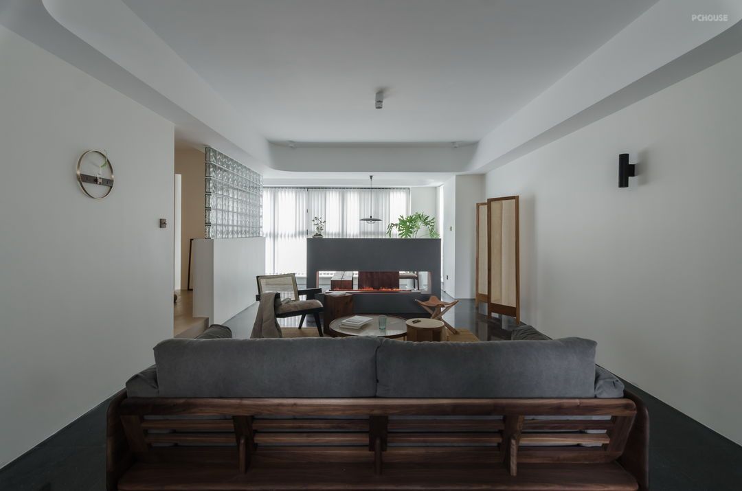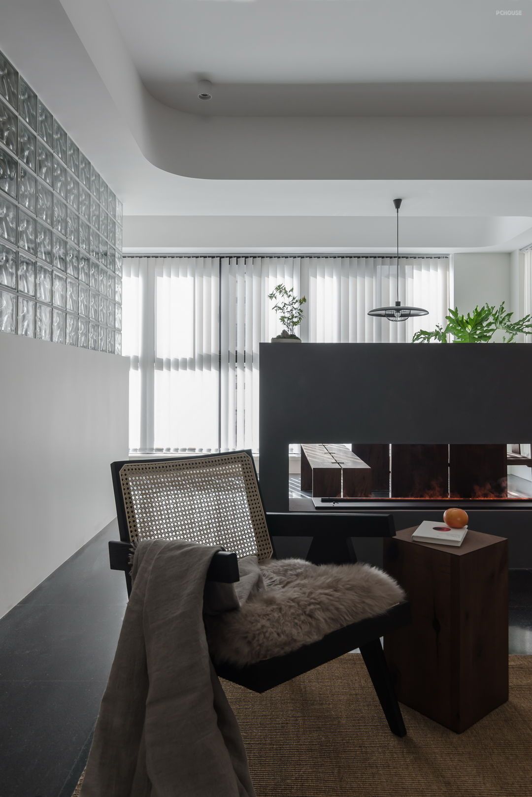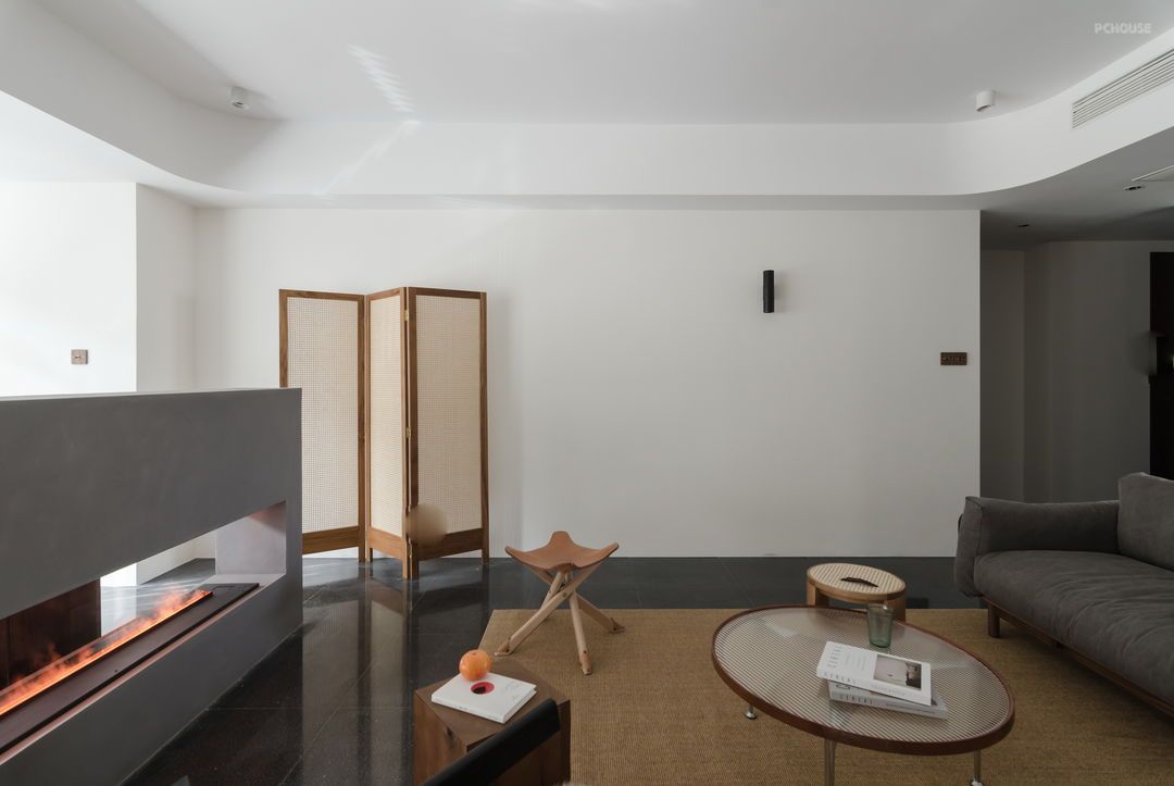 ▲客厅西立面。实木、藤编、皮革、火炉传递出诗意的气息,深色水磨石温润而克制。