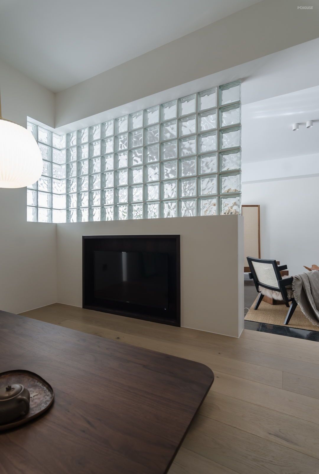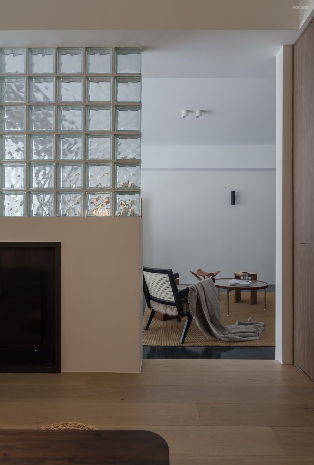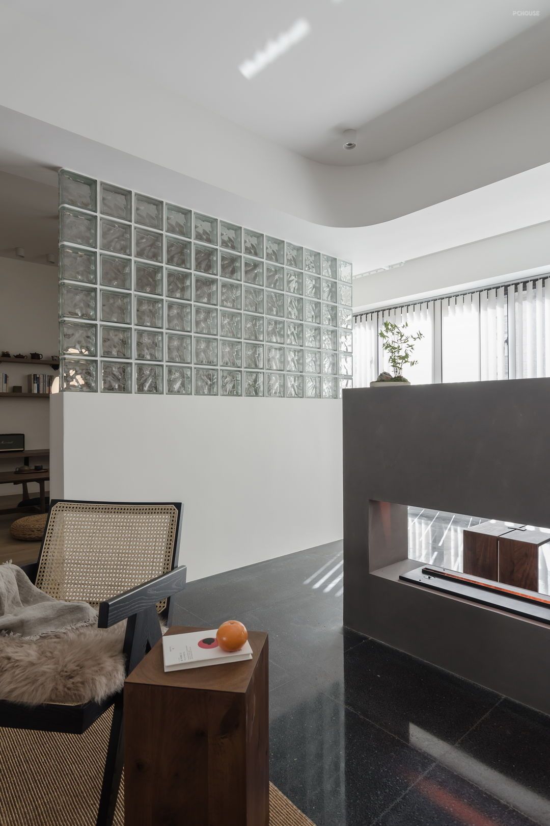 ▲客厅东立面。东侧入口通往半开放式书房,由半高墙和玻璃砖与客厅做出功能划分。