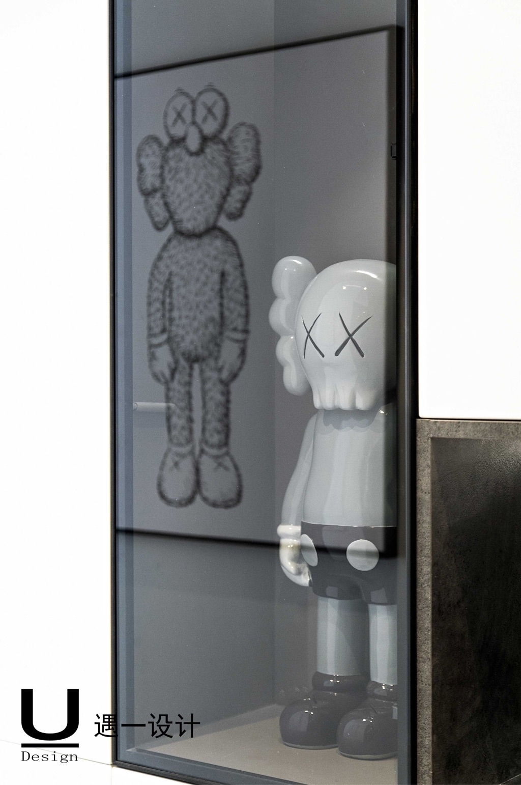 特别定制玻璃橱窗放置屋主喜欢的玩偶。n橱窗倒影中与玩偶同主题的kwas挂画,用光影的关系使两个面交相呼应。