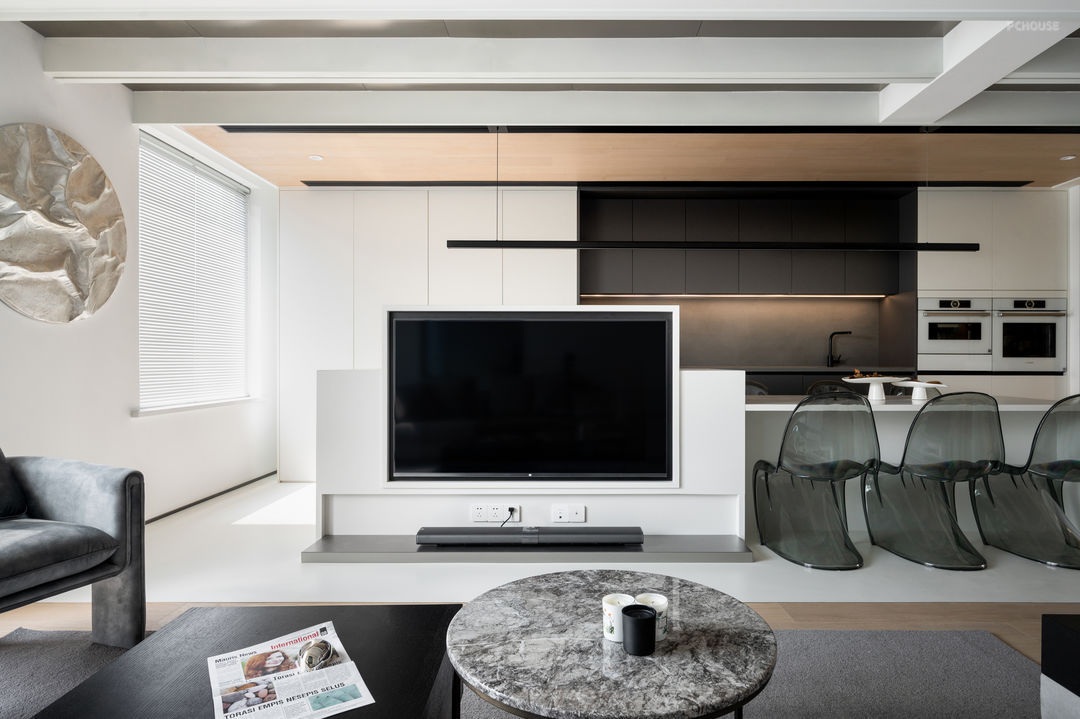 电视长在了餐桌上,关于这个结构的制作我们花了不少力气,既要保证受力安全,又要使之统一,美观。这么做也是不想再以电视机为客厅的中心,因此弱化他的存在。