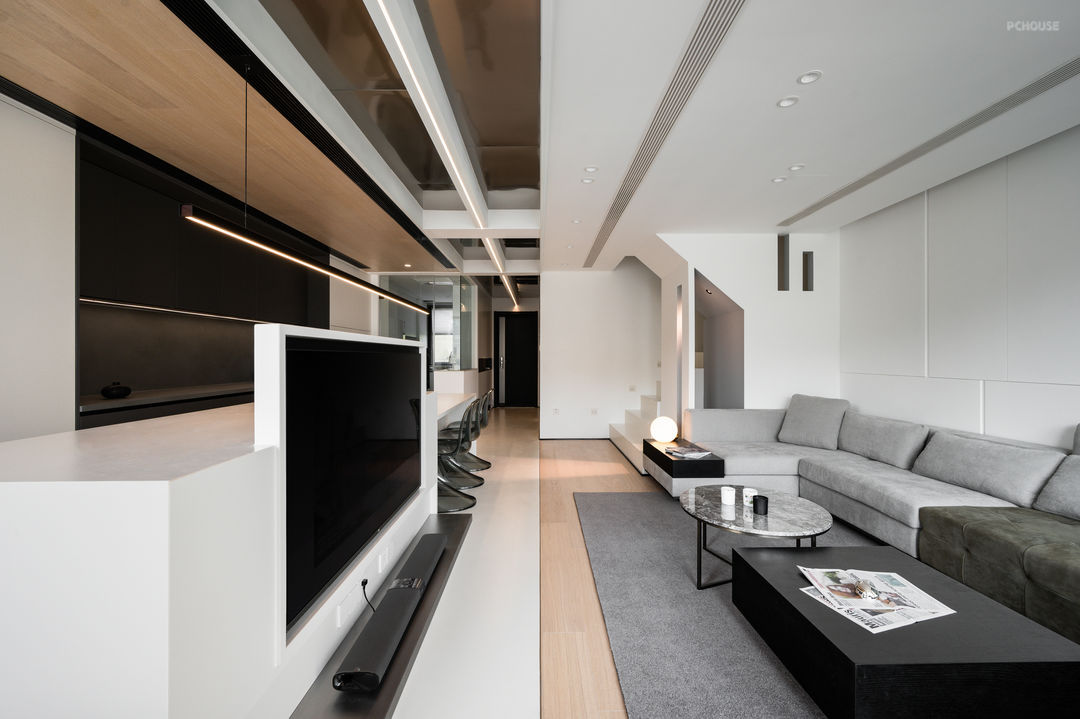 右侧以玻璃代替实墙,通透度就增加了很多。设计中的“中轴线”贯穿两根大梁,这样就不用降低顶面来包裹梁了。原本结构的劣势反倒是变成了结构特色。 线灯(此图未开灯)赋予了中轴线第二个作用——入户照明,并且强化出交通动线的关系,从入户开始,引导深入。