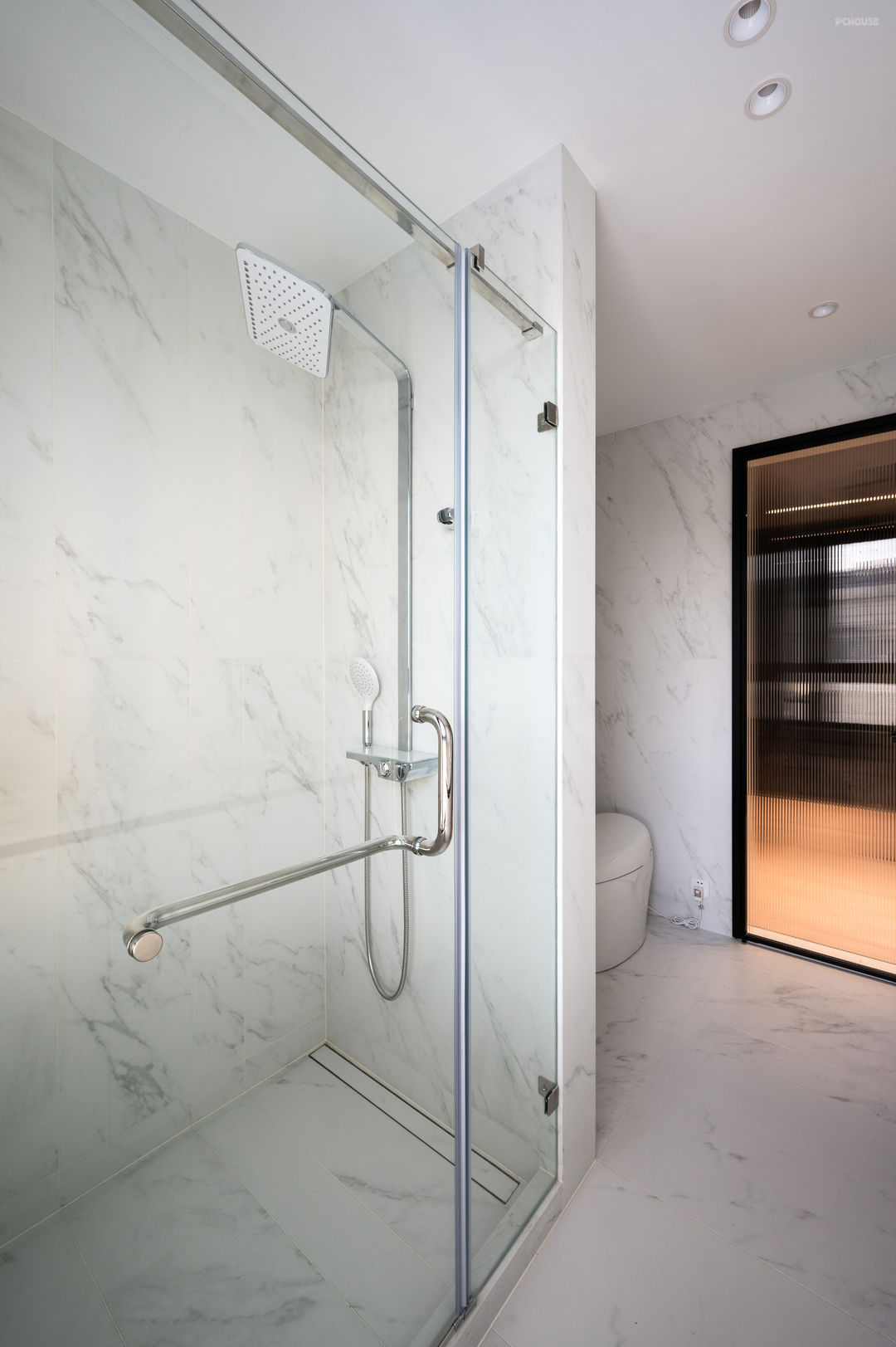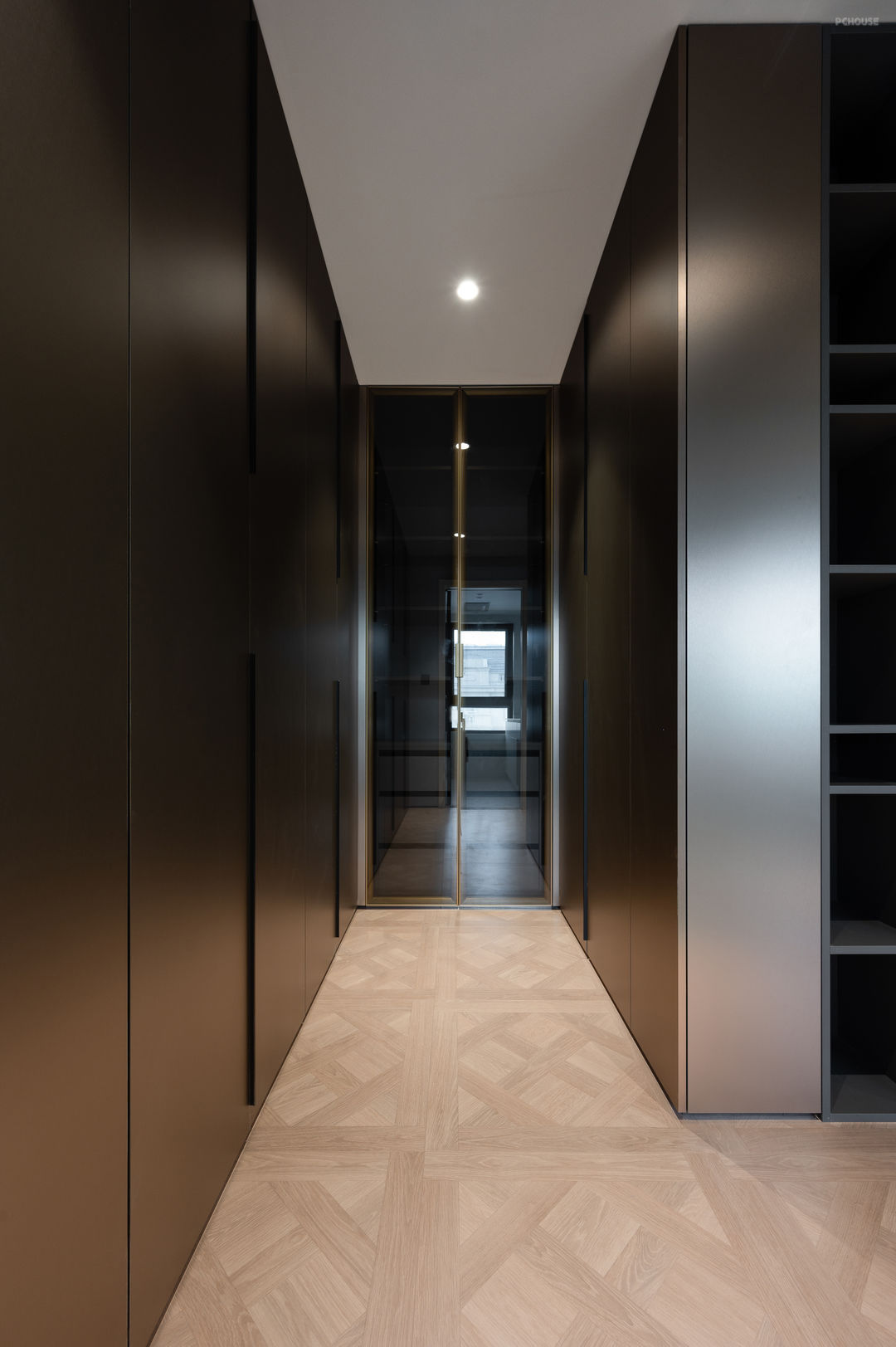 将原本独立的套间墙体打通,形成真正意义上的套间概念,不但增加了衣帽间的储纳面积,还增加了楼梯间的功能,嵌入式冰箱的置入丰富了二楼水吧台的功能。 主卫的三分离格局将洗手台独立出来,还能在双台盆边上增加一处梳妆台。