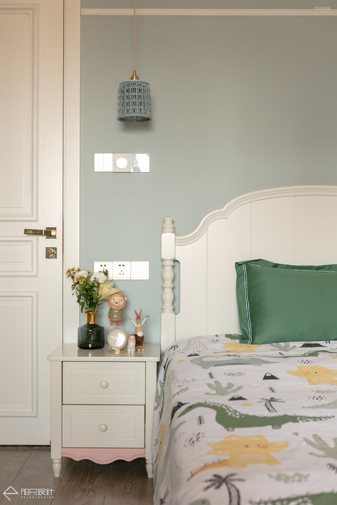 床边的胡桃木斗柜典雅端庄,呈现温馨稳重的氛围感;大地色的暗纹墙纸透露着成熟、优雅的质感,让空间又增添了几分色彩!
