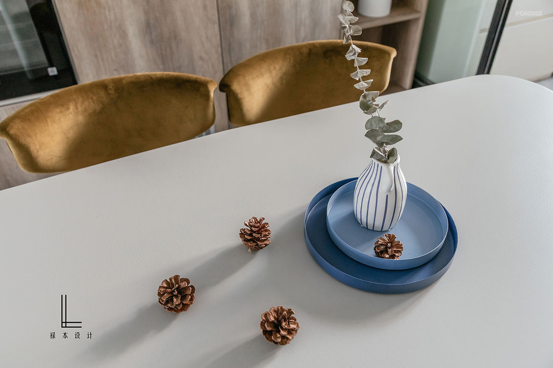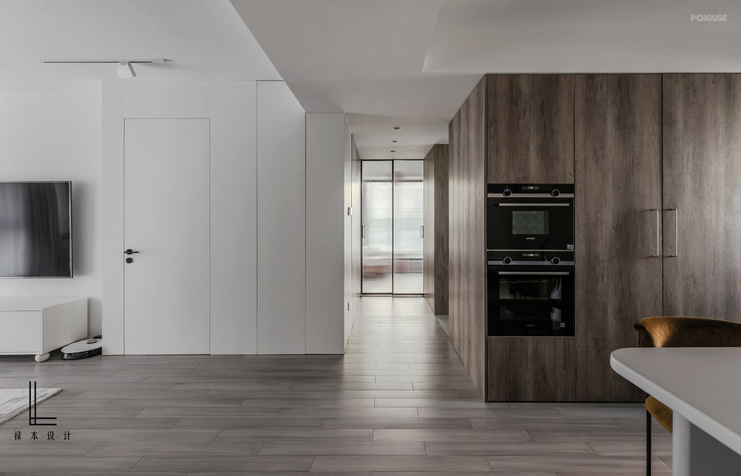 胡桃木纹让大面积留白的空间多了一些稳重,黄色蓝色餐椅跳色,浅灰色餐桌与白色丝网吊灯相得益彰;餐厅动线分明,厨房功能外延,提升厨房与餐厅的互动。西北套间与厨房玻璃移门轨道内嵌入顶,极简、通透、大方。