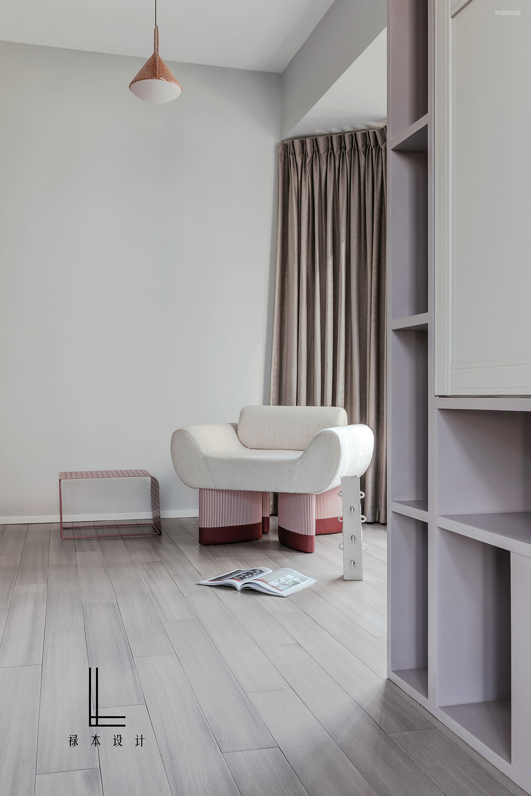 这是个功能储物的区域,这是一个可以休闲品茶的区域,这一个儿童玩耍的区域,这是个从进门就可以看到窗外的区域,这是个随时可以安排卧室的区域。各种低饱和度的材质颜色,让空间活泼轻松。