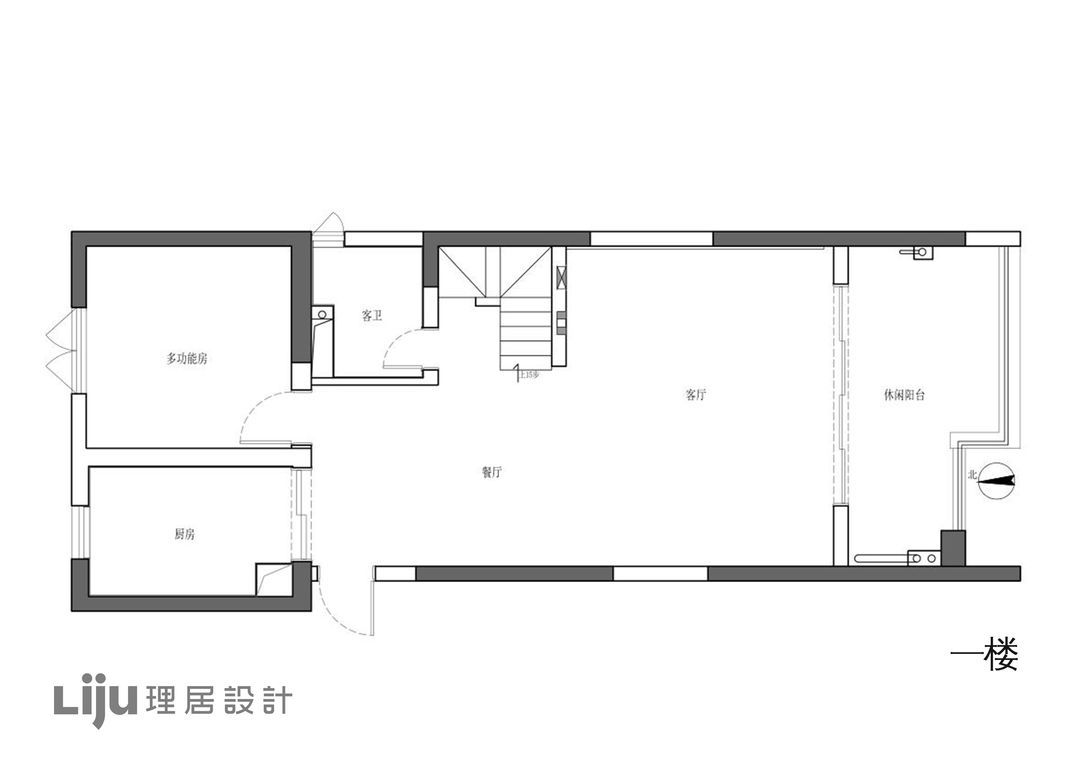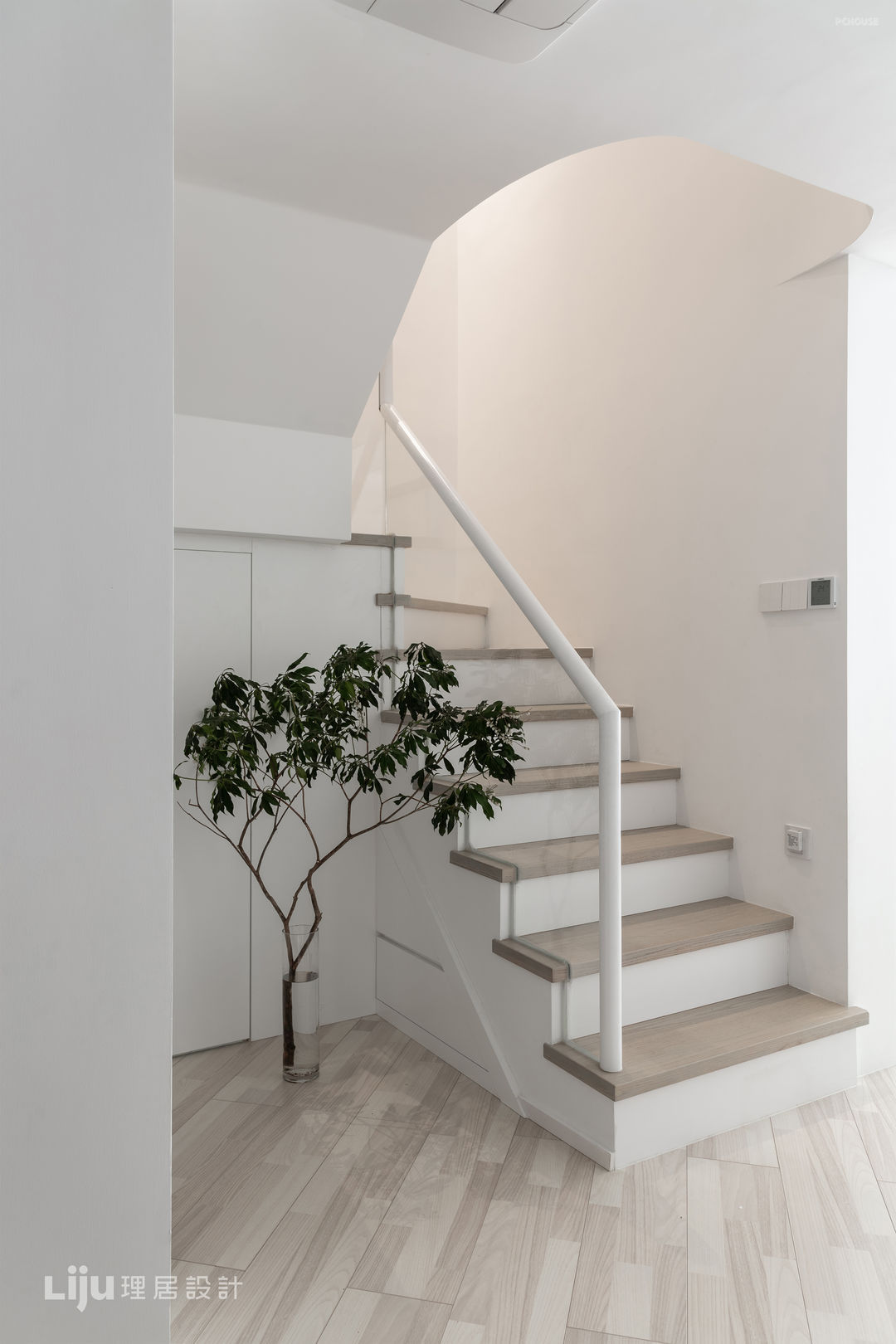 楼梯旁利用电视背景与楼梯之间的距离与角度所形成的储藏间,是一个隐藏式功能间。