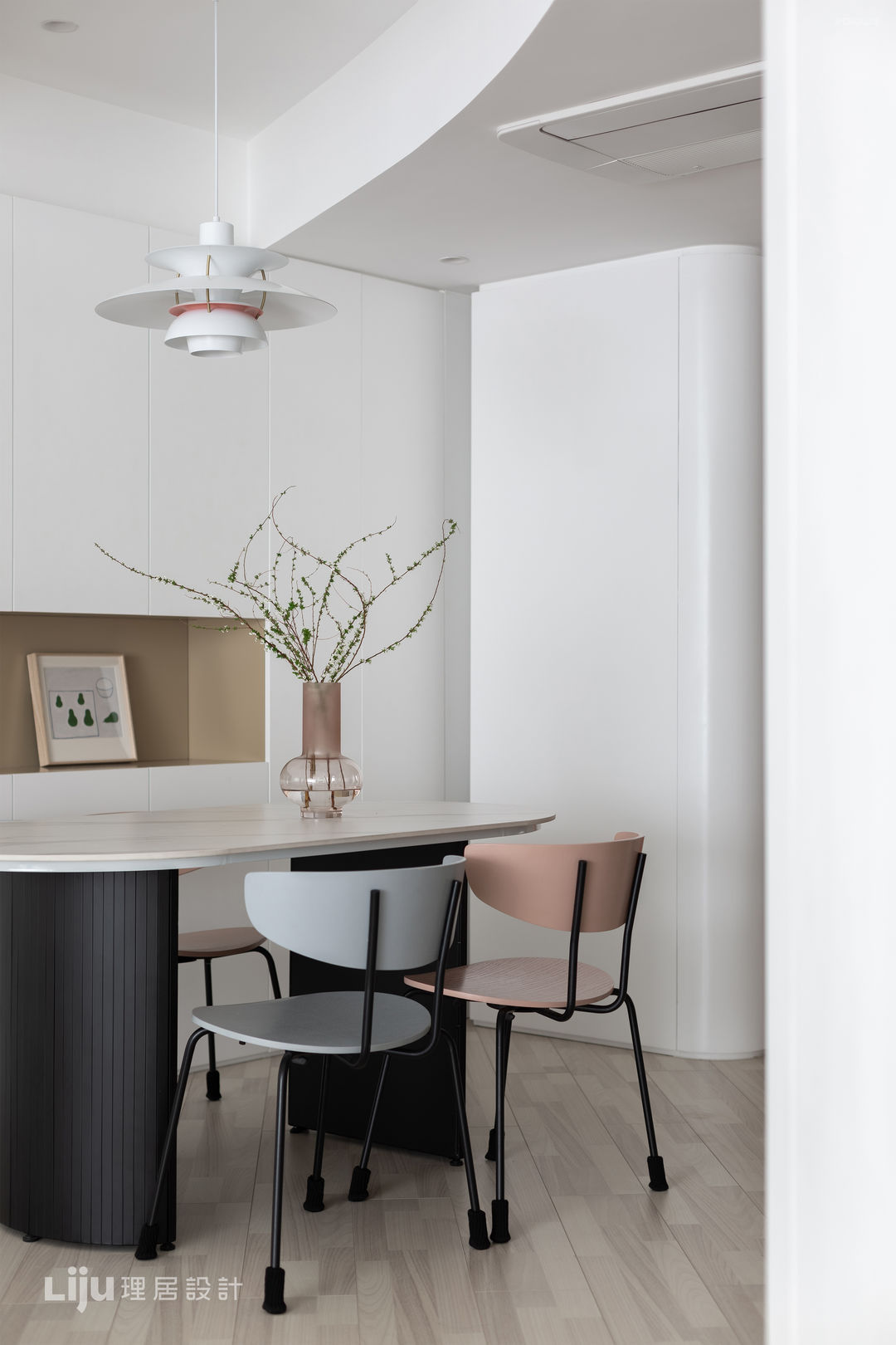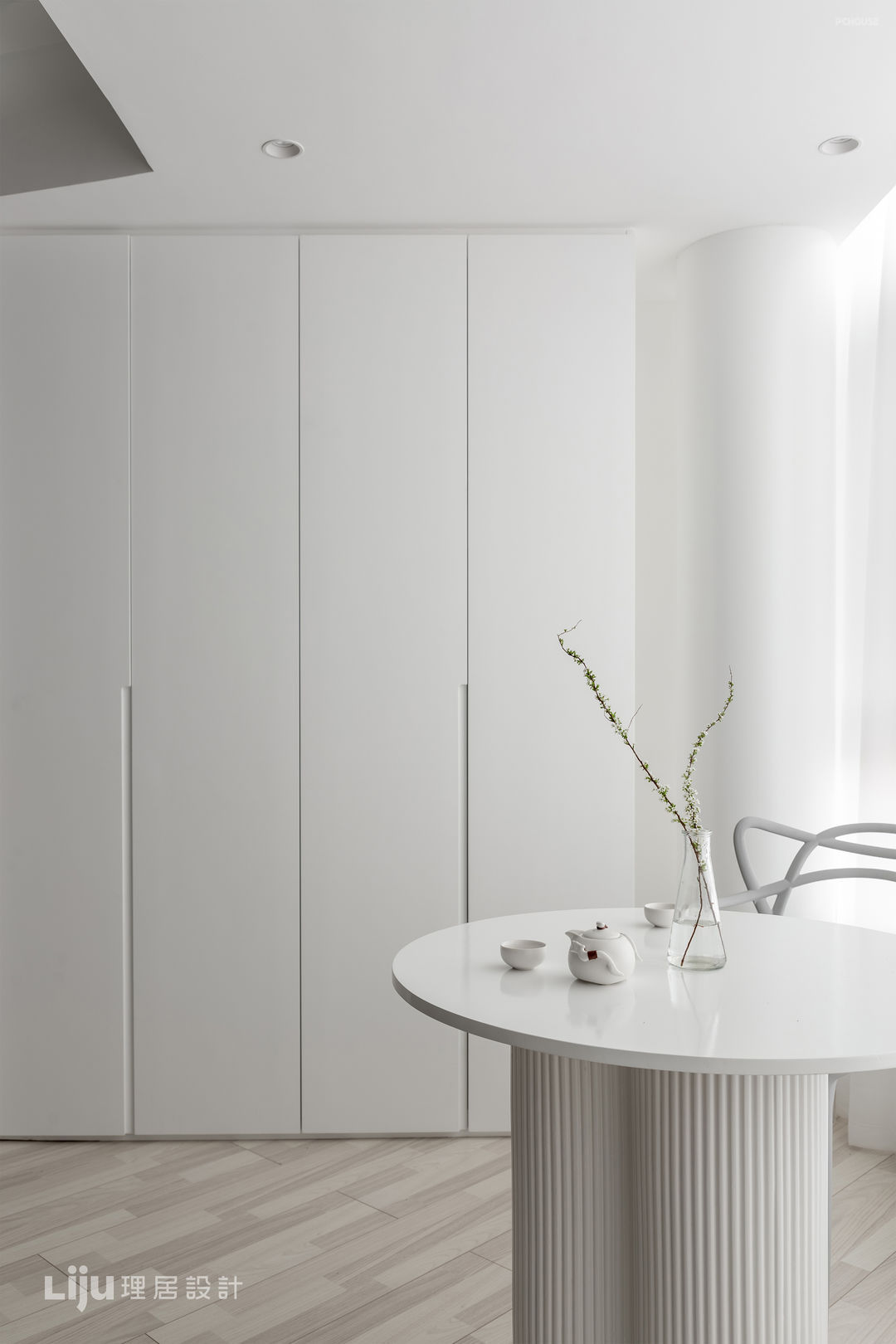 优雅而流畅的空间线条背后,是结合了房屋结构中的墙体位置,无形中消解了原本功能间会带来的所有突兀阳角,打造出公区的开阔视野。