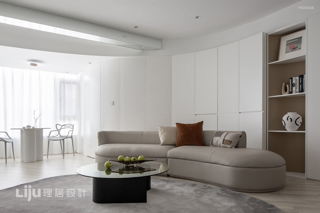沙发背后的弧形柜体,是房屋结构,也是功能本身。