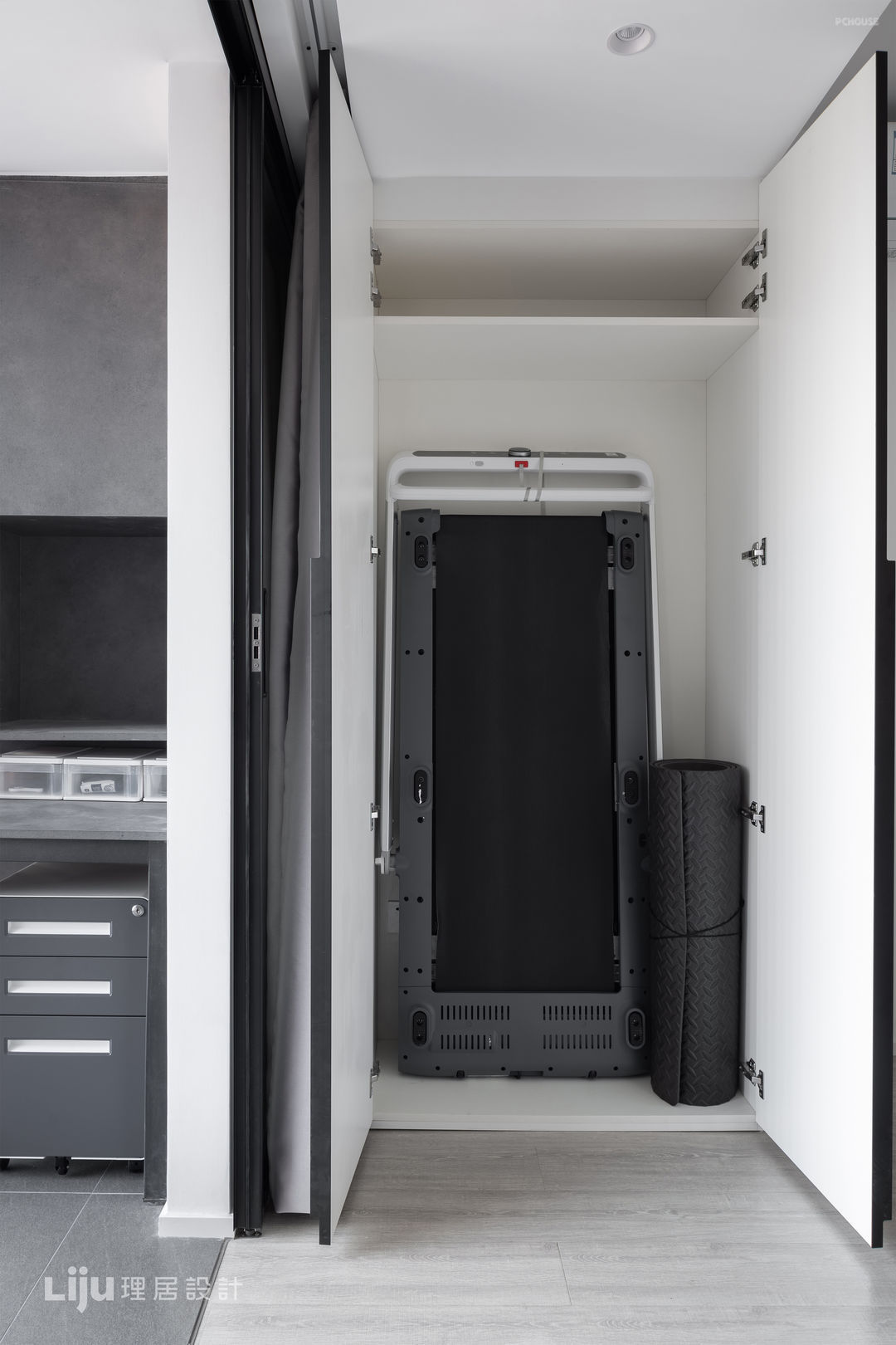 书房旁的柜体特意设置成全开放式,可用来放置屋主的折叠跑步机,随时取出来就可以在家中开始锻炼。