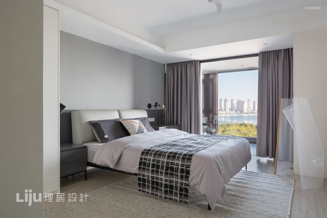 主卧是属于男女主人的独立空间,浅灰与苔藓绿的组合充满沉静放松的氛围感。